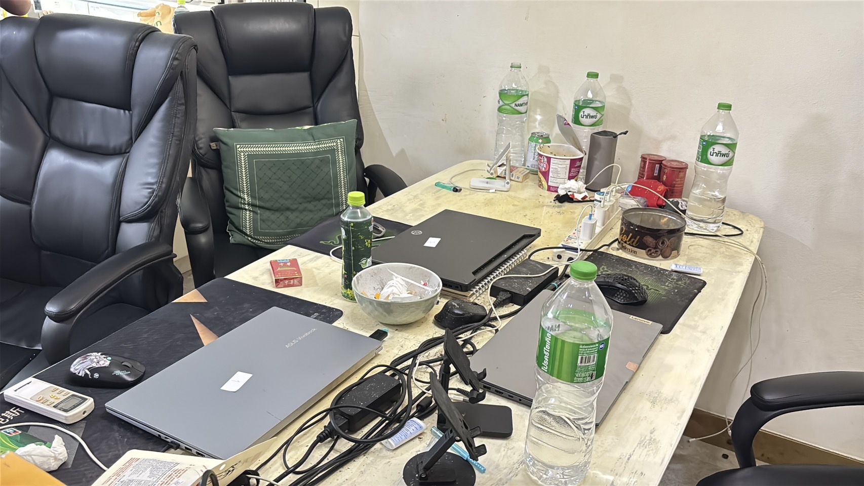 เมื่อเวลา 15.00 น.( 24 ก.พ.68 ) พ.ต.ท.กวิณวัชร์ อารยะสุริวงศ์ รอง ผกก.ตม.ชลบุรี พ.ต.ท.ปิยะพงษ์ เอนสาร สวญ.ตร.ทท.พัทยา พร้อมด้วยตำรวจชุดสืบสวนตรวจคนเข้าเมืองจังหวัดชลบุรี ตำรวจชุดวสืบสวนท่องเที่ยวเมืองพัทยา ตำรวจชุดสืบสวน สภ.หนองปรือ ตำรวจชุดสืบสวนจังหวัดชลบุรีสนธิกำลังกว่า 30 นาย นำหมายค้นศาลจังหวัดพัทยาเลขที่ ค.39 / 2568 เข้าทำการตรวจค้น บ้าน ภายในหมู่บ้านแห่งหนึ่ง ย่านซอยเขาตาโล หมู่ 10 ต.หนองปรือ อ.บางละมุง จ.ชลบุรี หลังได้รับร้องเรียนจากกลุ่มชาวบ้าน ว่ามีกลุ่มชาวจีนใช้ชีวิตอยู่ในบ้านลักษณะผิดปกติ สงสัยว่าจะมีการลักลอบกระทำผิดกฎหมาย จากการเข้าปิดล้อม บ้านหลังดังกล่าว เป็นบ้านหรู มีเนื้อที่ 150 ตารางวา และมีรั้วล้อมรอบขอบชิด ซึ่งจากการเข้าตรวจสอบในเบื้องต้นพบกลุ่มชาวจีน ทั้งชายและหญิง กำลังนั่งอยู่หน้าคอมพิวเตอร์โน๊ตบุ๊ก และมีโทรศัพท์มือถือวางเรียงรายไม่ 20 เครื่อง ตำรวจจึงแสดงหมายค้นและเข้าทำการตรวจสอบอย่างละเอียด โดยทำการตรวจยึด คอมพิวเตอร์โน๊ตบุ๊กได้จำนวน 3 เครื่อง และ โทรศัพท์มือถือ 29 เครื่อง และทำการสอบปากคำ กลุ่มชาวจีนซึ่งนั่งอยู่ภายในบ้าน เป็นผู้หญิง 1 คน ( ถือวีซ่านักท่องเที่ยว ) และ ผู้ชาย 4 คน ( ถือวีซ่านักเรียน )