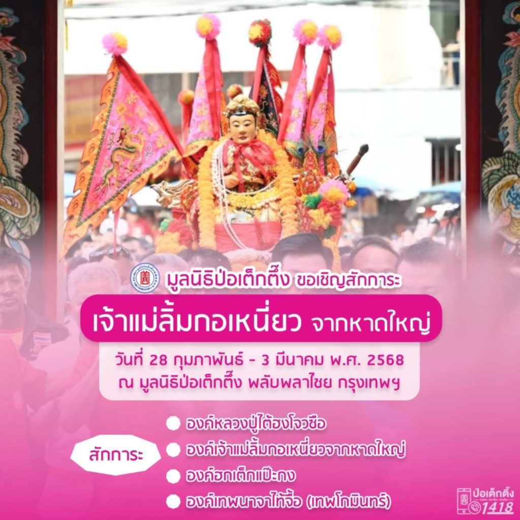 ระหว่างวันที่ 28 กุมภาพันธ์ – 3 มีนาคม 2568 มูลนิธิป่อเต็กตึ๊ง ร่วมกับมูลนิธิมิตรภาพสามัคคี (ท่งเซียเซี่ยงตึ๊ง) หาดใหญ่ ขอเชิญศิษยานุศิษย์ และสาธุชนที่เลื่อมใส ร่วมสักการะเจ้าแม่ลิ้มกอเหนี่ยวจากหาดใหญ่ องค์ฮกเต็กแป๊ะกง และองค์นาจาไท้จื้อ (เทพโกมินทร์) ณ บริเวณลานสำนักงาน มูลนิธิป่อเต็กตึ๊ง พลับพลาไชย กรุงเทพฯ โดยวันศุกร์ที่ 28 กุมภาพันธ์ 2568 เวลาประมาณ 17.30 น. คณะเจ้าแม่ลิ้มกอเหนี่ยวเดินทางถึงกรุงเทพฯ เคลื่อนขบวนผ่านบริเวณวงเวียนโอเดียน ไปตามถนนเยาวราช เจริญกรุง โดยขบวนจะแห่ถึงมูลนิธิป่อเต็กตึ๊ง และเปิดให้ผู้มีจิตศรัทธาเข้าสักการะ เวลาประมาณ 18.00 น. และในวันเสาร์ที่ 1 มีนาคม – วันอาทิตย์ที่ 2 มีนาคม 2568 มูลนิธิป่อเต็กตึ๊งเปิดให้ผู้มีจิตศรัทธาเข้าสักการะตั้งแต่เวลา 06.00 – 21.00 น. สำหรับวันจันทร์ที่ 3 มีนาคม 2568 เวลาประมาณ 18.30 น. จะมีพิธีส่งเจ้าแม่ลิ้มกอเหนี่ยวกลับหาดใหญ่