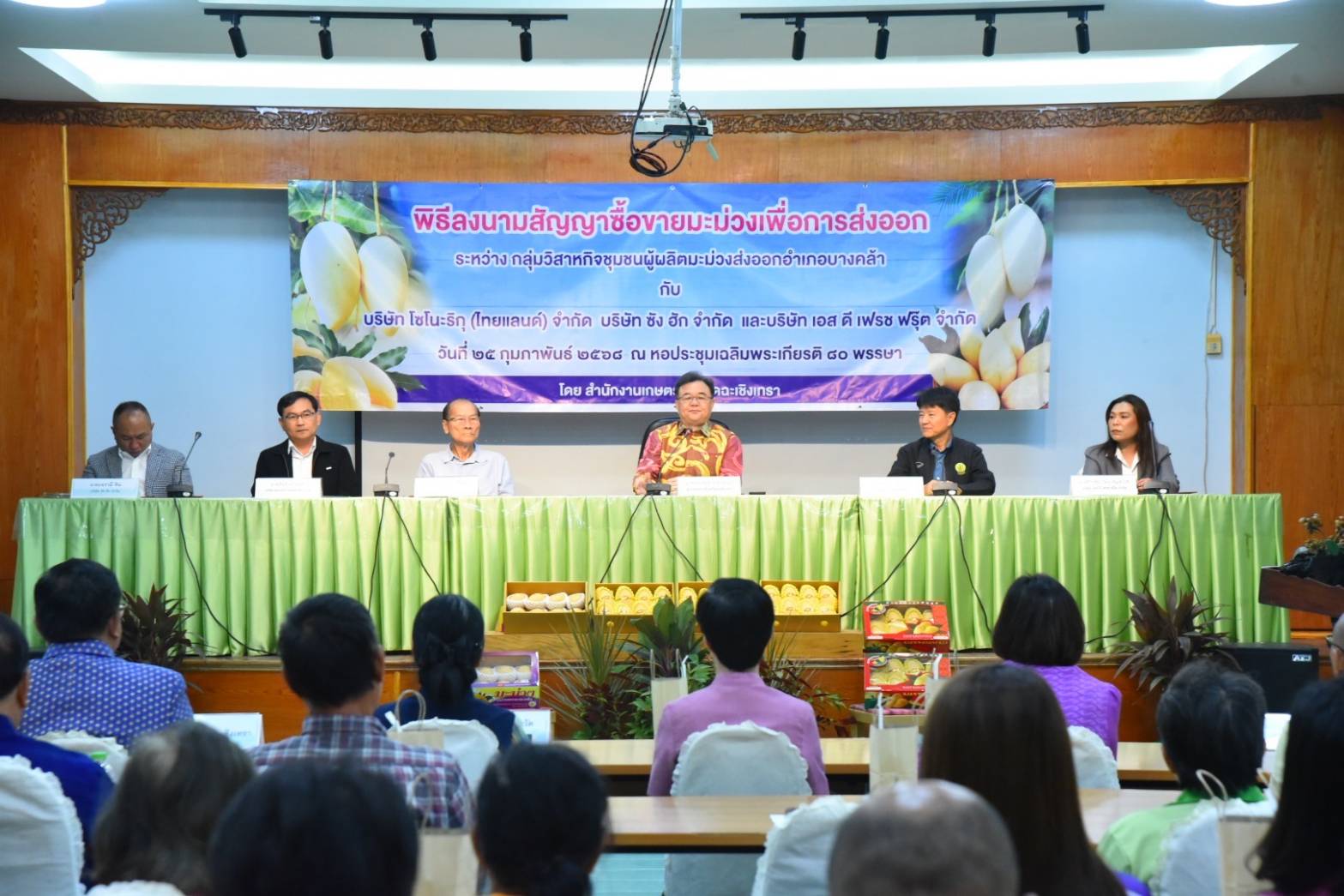 วันที่ 25 กุมภาพันธ์ 2568 ที่ หอประชุมเฉลิมพระเกียรติ 80 พรรษา สำนักงานเกษตรจังหวัดฉะเชิงเทรา นายขจรเกียรติ รักพานิชมณี ผู้ว่าราชการจังหวัดฉะเชิงเทรา ประธานพิธีลงนามสัญญาซื้อขายมะม่วงเพื่อการส่งออก โดยมี นายดนัย ปัญจพิทยากุล เกษตรจังหวัดฉะเชิงเทรา หัวหน้าส่วนราชการ และเกษตรกรจังหวัดฉะเชิงเทรา เข้าร่วมฯ