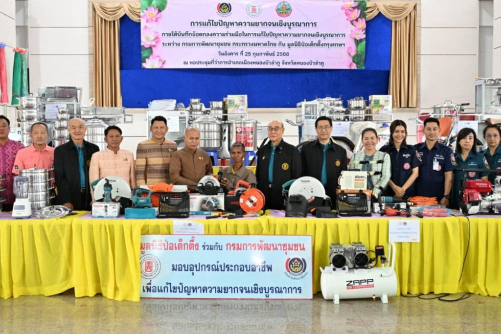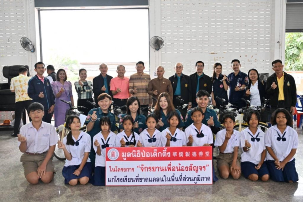 เมื่อวันอังคารที่ 25 กุมภาพันธ์ พ.ศ. 2568 มูลนิธิป่อเต็กตึ๊ง นำโดย นายสุรพงษ์ เตชะหรูวิจิตร กรรมการและรองเลขาธิการ เป็นประธานในพิธี พร้อมด้วย นายวิรุฬ เตชะไพบูลย์ ที่ปรึกษาประธานกรรมการ นายสุรพงศ์ เสรฐภักดี กรรมการและรองเหรัญญิก นางศิริพร กระจ่างหล้า ผู้จัดการฝ่ายสังคมสงเคราะห์ นางสาวศุภรัตน์ สมบัติเจริญไทย หัวหน้าแผนกส่งเสริมการศึกษาและอาชีพ และนางสาวเนาวรัตน์ วรรณศิริ หัวหน้าแผนกหน่วยแพทย์สงเคราะห์ชุมชน นำทีมลงพื้นที่จังหวัดหนองบัวลำภู (จังหวัดที่ 18 ของทางภาคตะวันออกเฉียงเหนือ) มอบวัสดุอุปกรณ์ประกอบอาชีพแก่ครัวเรือนยากจน จำนวน 21 ครัวเรือน เพื่อให้สามารถประกอบอาชีพเลี้ยงตนเองและครอบครัว และมอบรถจักรยานแก่โรงเรียนชนบทที่ขาดแคลน จำนวน 2 โรงเรียน รวมจำนวน 20 คัน เพื่อให้นักเรียนที่ประสบปัญหาในการเดินทางได้ยืมเรียน รวมถึงเป็นการแบ่งเบาภาระค่าพาหนะแก่ผู้ปกครองได้อีกทางหนึ่ง อีกทั้งยังเสริมสร้างให้นักเรียนได้ออกกำลังกาย เรียนรู้กฎจราจร เรียนรู้การแบ่งปัน และดูแลรักษาสาธารณสมบัติร่วมกัน รวมมูลค่าการดำเนินการช่วยเหลือชาวหนองบัวลำภูในครั้งนี้ทั้งสิ้น 523,160 บาท (ห้าแสนสองหมื่นสามพันหนึ่งร้อยหกสิบบาทถ้วน) นอกจากนี้ มูลนิธิฯ ยังได้จัดหน่วยแพทย์สงเคราะห์ชุมชน นำทีมแพทย์อาสาฯ เจ้าหน้าที่หน่วยแพทย์ ทีมบรรเทาสาธารณภัย (กู้ชีพ) และอาสาสมัครลงพื้นที่ให้บริการประชาชนฟรี ประกอบด้วย บริการตรวจรักษาโรคทั่วไป จ่ายยา ทันตกรรม คัดกรองเบาหวาน กิจกรรมนันทนาการ ตรวจวัดสายตาพร้อมแจกแว่น บริการตัดผม ฯลฯ ให้แก่ประชาชนในพื้นที่ โดยมี นายสุรศักดิ์ อักษรกุล ผู้ว่าราชการจังหวัดหนองบัวลำภู พร้อมด้วย นายสุรพล แก้วอินธิ ผู้ตรวจราชการกรมการพัฒนาชุมชน เป็นประธานร่วมในพิธี และคณะมูลนิธิรวมใจหนองบัวลำภู เป็นผู้ประสานงานและร่วมในพิธี รวมทั้ง อาสาสมัครศิลปินมูลนิธิป่อเต็กตึ๊ง นำโดย นายภัทรพล แก้วสกุณี (เค-ภัทรพล) นางสาวพัชรมัย บุญเลิศกุล (แพรว-พัชรมัย) ร่วมในพิธี โดยมี ประชาชน เยาวชน และผู้แทนจากสถาบันการศึกษา เป็นผู้รับมอบ ณ บริเวณหอประชุมที่ว่าการอำเภอเมือง จังหวัดหนองบัวลำภู
