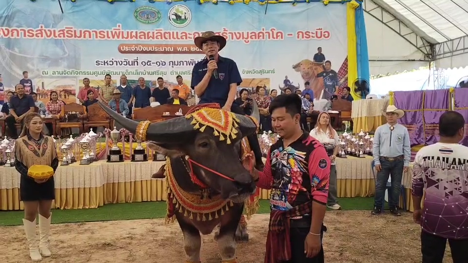 วันที่ 26 ก.พ.ุ68 ผู้สื่อข่าวรายงานถึงบรรยากาศเก็บตกสีสัน ของการจัดงานโครงการส่งเสริม และ เพิ่มผลผลิต และการสร้างมูลค่าโค-กระบือ ประจำปี 2568 ที่จัดขึ้น ณ.ลานจัดกิจกรรมศูนย์พัฒนาเด็กเล็กบ้านศรีสุข หมู่ที่1 ตำบศรีสุข อำเภอศรีณรงค์ จังหวัดสุรินทร์ เมื่อสัปดาห์ที่ผ่านมา โดยภายในงานได้รับเกียรติจากนายล้ำเลิศ พัวพัฒนโชติ สมาชิกสภาผู้แทนราษฎรจังหวัดสุรินทร์ เขต 6 เป็นประธานกล่าวเปิดงานอย่างเป็นทางการบนหลังกระบือ หรือควาย นั่นเอง แม้ท่าน ส.ส.จะไม่คุ้นชินกับการขี่ควายเปิดงานสักเท่าไหร่ แต่ก็พูดเปิดงานได้จนจบแบบเสียวๆ โดยมีเจ้าของควายคอยดูแลอยู่ใกล้ชิด เรียกความสนใจและสามารถสรางสีสันใหกับพิธีเปิดได้เป็นอย่างดี