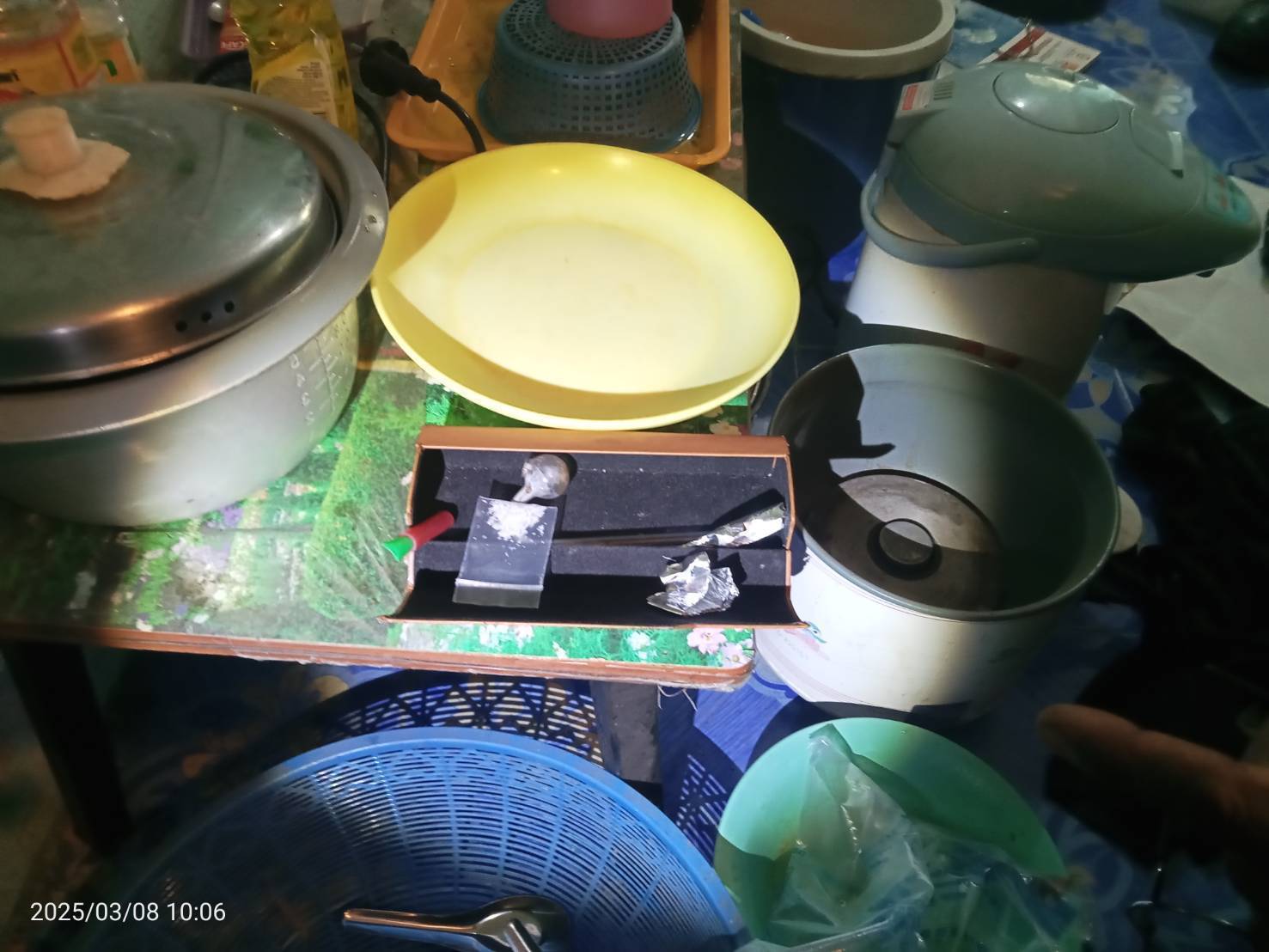 ทำสายเสียก่อน ตามประมวลกฎหมายวิธีพิจารณาความอาญา มาตรา ๙๒ (๕)การดำเนินการจับกุมและตรวจค้นพบของกลาง จำนวน ๓ รายการ ซึ่งตรวจพบในตำแหน่ง ดังนี้ของกลางลำดับที่ ๑ ยาเสพติดให้โทษประเกท ๑ (ยาไอซ์) ชนิดเกล็ดสีขาว บรรจอยู่ในถุงพลาสติกสีโส ชนิดปากรูดปิดขนาด ๓x๕ ชม. จำนวน ๑ ถุง (น้ำหนักชั่งไม่รวมถุง) ๕ กรัม ใส่อยู่ในกล่องแว่นตาสีน้ำตาลพบอยู่โต๊ะในห้องนอนของผู้ถูกจับและนำตัวส่งสภอ.เพื่อดำเนินคดีตามกฏหาย