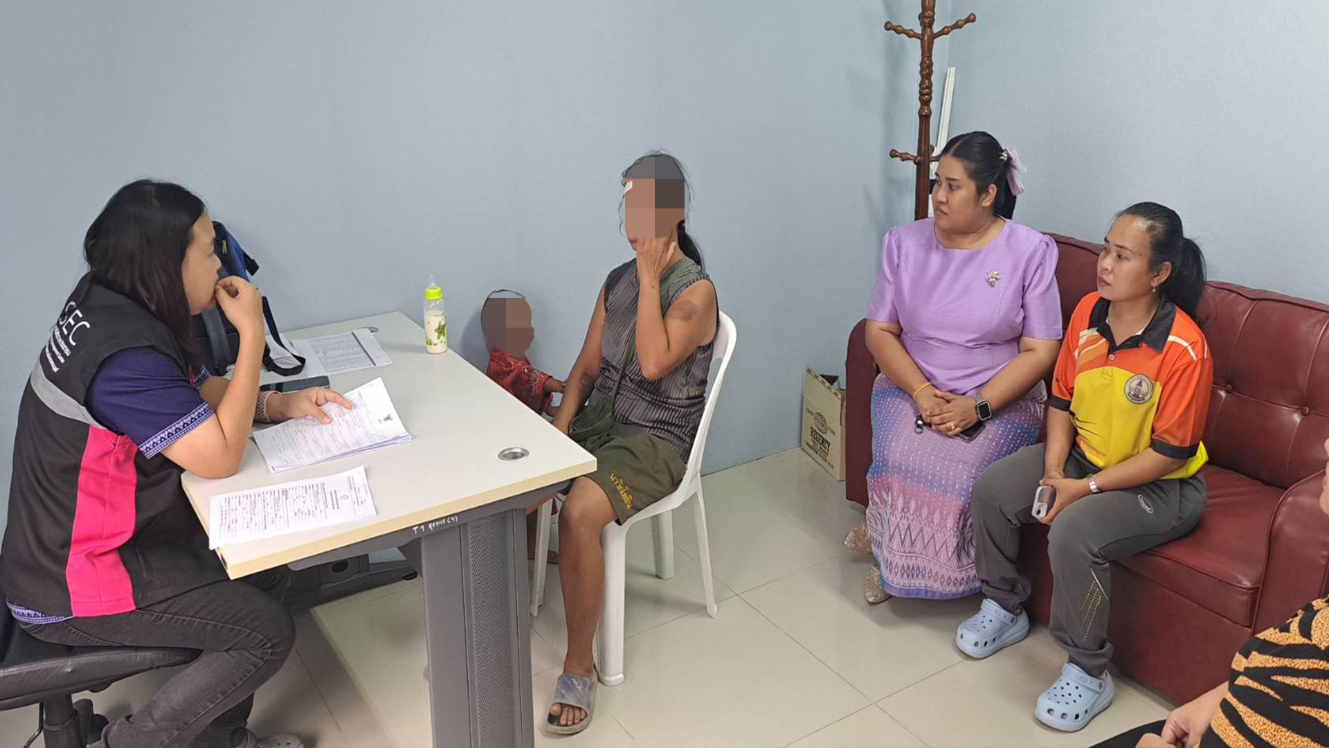 โดยเจ้าหน้าที่สำนักงานพัฒนาสังคมและความมั่นคงของมนุษย์จังหวัดชลบุรี ได้นำตัวแม่เด็กและเด็กที่ถูกทำร้ายร่างกาย ร่วมถึงลูกคนเล็กอีกคน แยกจากสามีโหดรายนี้ทันที เพื่อสอบถามข้อมูล ที่ สภ.สัตหีบ ก่อนจะประเมินแล้วควรแยกออกจากกัน จึงนำตัวเด็กและแม่เด็กและลูกคนเล็กไปยัง บ้านพักเด็กบางละมุง เพื่อฟื้นฟูสภาพจิตใจเด็กร่วมถึงแม่เด็ก ก่อนจะมีการพูดคุยอีกครั้งว่าจะประสงค์แจ้งความดำเนินคดีไหม เพราะตอนนี้ยังอยู่ในอาการหวาดกลัวอย่างรุนแรง ก่อนจะนำทีมสหวิชาชีพสอบถามเด็กถึงการถูกทำร้ายเพื่อแจ้งความดำเนินคดีตามกฎหมายต่อไป