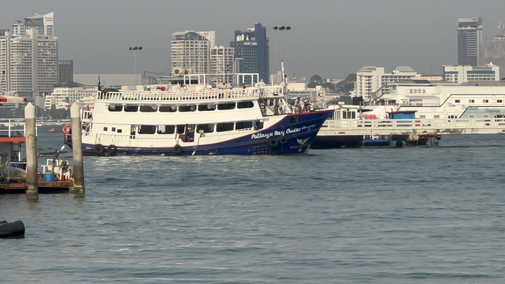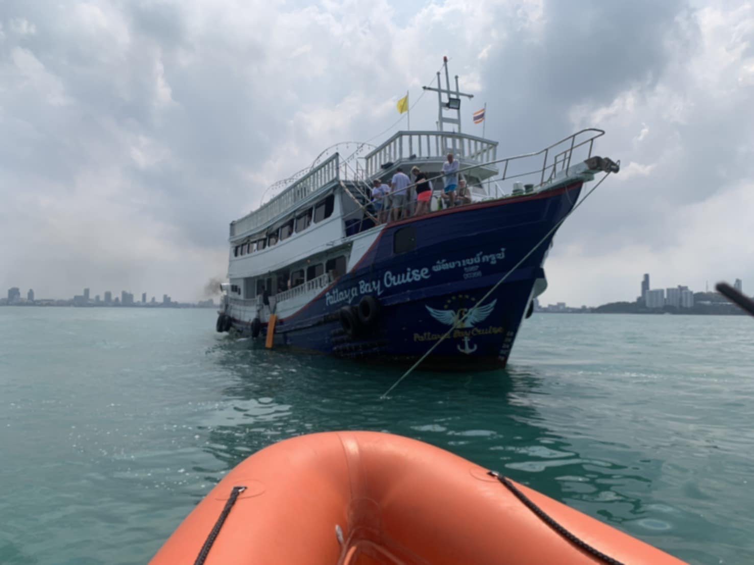 ไปถึง ห่างจากเกาะประมาณ 500 เมตร พบเรือนำเที่ยว 2 ชั้น ลำตัวเรือยาวกว่า 70 ฟุต ชื่อเรือ “พัทยาเบย์ครูซ” โดยพบกลุ่มควันสีดำกำลังพวยพุ่งออกมาจากใต้ท้องเรือ คาดว่าน่าจะเป็นห้องเครื่อง ซึ่งกลุ่มควันลอยสูงขึ้นไปบนท้องฟ้า จนสามารถมองเห็นได้จากในระยะไกล เจ้าหน้าที่กู้ภัยทางทะเล , ไต๋เรือ ได้ร่วมกันตรวจสอบ ปรากฏว่าเหตุการณ์ดังกล่าว ไม่ได้เกิดจากการไฟ ไหม้ แต่เครื่องยนต์ขัดข้อง และระบบท่อไอเสีย จนเกิดควันดำจำนวนมาก