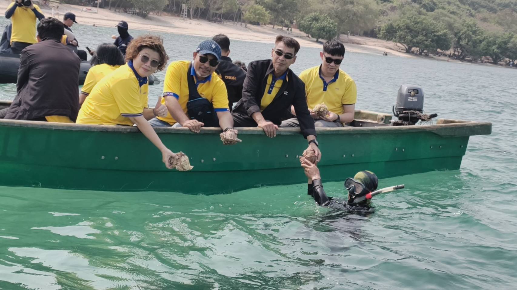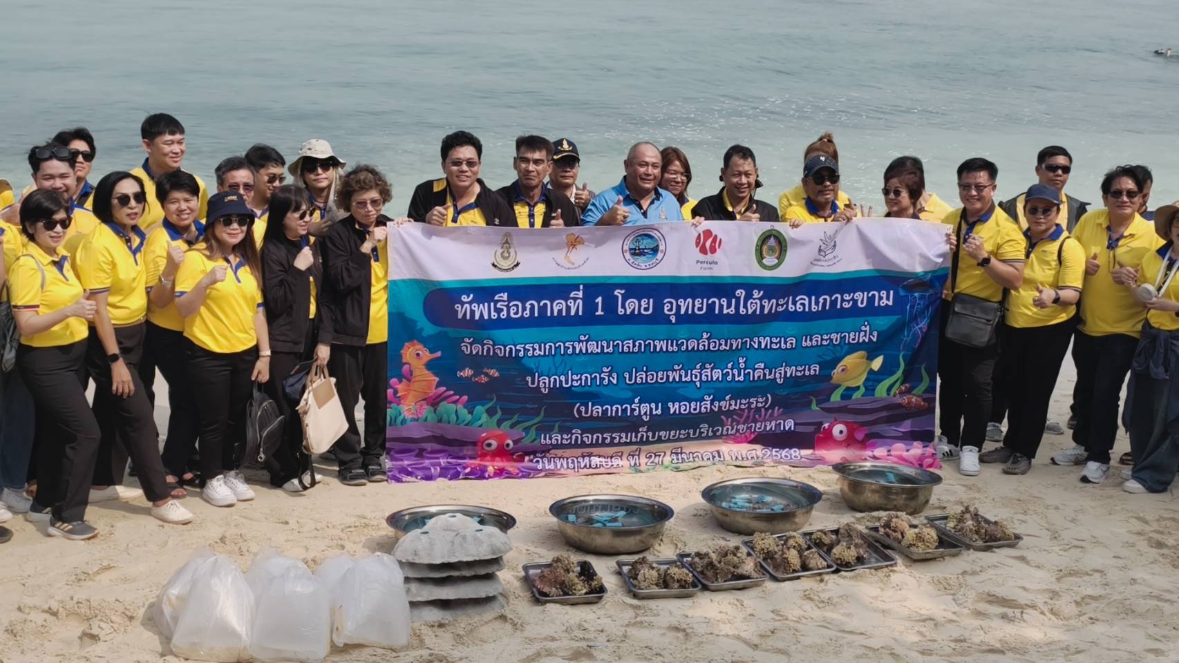 โดยกิจกรรมในวันนี้ ประกอบด้วย การมอบงบประมาณและเสื้อชูชีพ สนับสนุนกิจการท่องเที่ยวทัพเรือภาคที่ 1 ฟังบรรยายจากอาจารย์ ประสาน แสงไพบูร ประธานมูลนิธิกิจกรรมวิทยาศาสตร์ทางทะเลและการอนุรักษ์ ร่วมปลูกปะการังและปล่อยพันธุ์สัตว์น้ำสู่ท้องทะเล และร่วมเก็บขยะชายหาดบนเกาะขาม