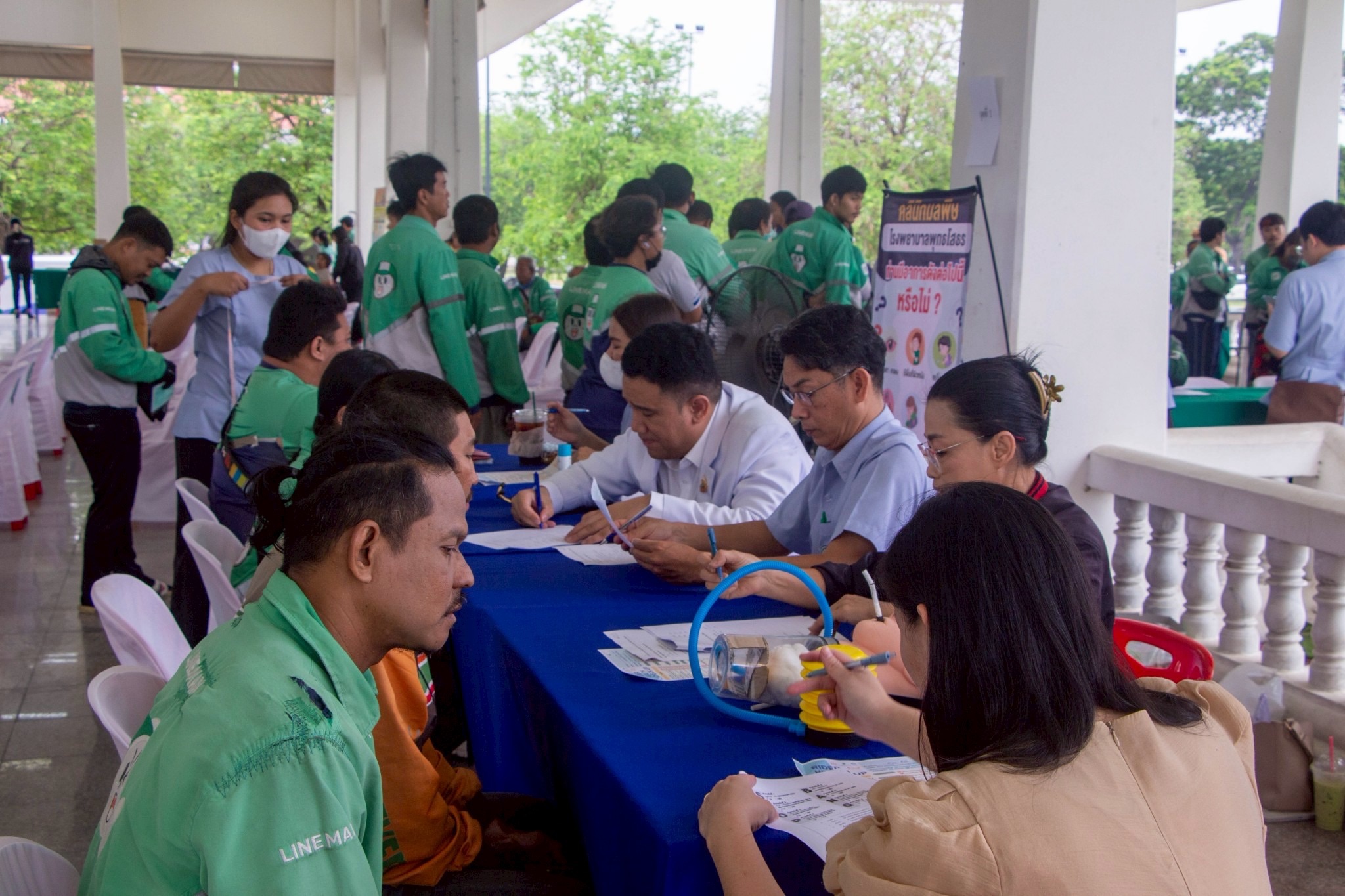 คัดกรองสุขภาพจิตเบื้องต้น ตรวจองค์ประกอบร่างกาย ด้วยเครื่อง Body Composition นอกจากนี้ยังมีจุดให้คำปรึกษาเรื่องสิทธิสุขภาพ ครอบคลุมทั้งประกันสังคมและหลักประกันสุขภาพ (30 บาท) โดยมีไรเดอร์ในจังหวัดฉะเชิงเทราเข้าร่วมกิจกรรมกว่า 150 คน