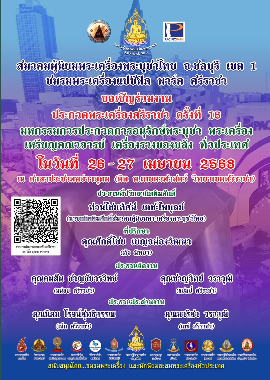 คุณคมสัน ชาญชัยวรวิทย์ (หน่อย ศรีราชา) ประธานสมาคมผู้นิยมพระเครื่องพระบูชาไทย จังหวัดชลบุรี เขต 1 หนึ่งในประธานจัดงานในครั้งนี้ กล่าวว่า งานมหกรรมการประกวดการอนุรักษ์พระบูชา พระเครื่อง เหรียญคณาจารย์ เครื่องรางของขลัง ทั่วประเทศ ครั้งที่ 16 นี้ จัดโดย สมาคมผู้นิยมพระเครื่องพระบูชาไทย จังหวัดชลบุรี เขต 1 ร่วมกับ ชมรมพระเครื่องแปซิฟิค พาร์ค ศรีราชา ใน วันเสาร์ที่ 26 และ วันอาทิตย์ที่ 27 เมษายน 2568 ณ ศาลาประชาคมอ่าวอุดม ต.ทุ่งสุขลา อ.ศรีราชา จ.ชลบุรี (ติดกับมหาวิทยาลัยเกษตรศาสรต์ วิทยาเขตศรีราชา) โดยมี คุณไชยทัศน์ เตชะไพบูลย์ (นายกกิตติมศักดิ์ สมาคมผู้นิยมพระเครื่องพระบูชาไทย) เป็นประธานที่ปรึกษากิตติมศักดิ์ คุณศักดิ์ไชย เบญจผ่องวัฒนา (ท้ง พัทยา) เป็นที่ปรึกษา คุณคมสัน ชาญชัยวรวิทย์ (หน่อย ศรีราชา) และ คุณชาญวิทย์ วราวุฒิ (แชมป์ ศรีราชา) เป็นประธานจัดงาน คุณนิคม โรจน์สุทธิวรรณ (เล็ก ศรีราชา) และ คุณมาริสา วรวุฒิ (เมย์ ศรีราชา) เป็นประธานในการประสานงาน