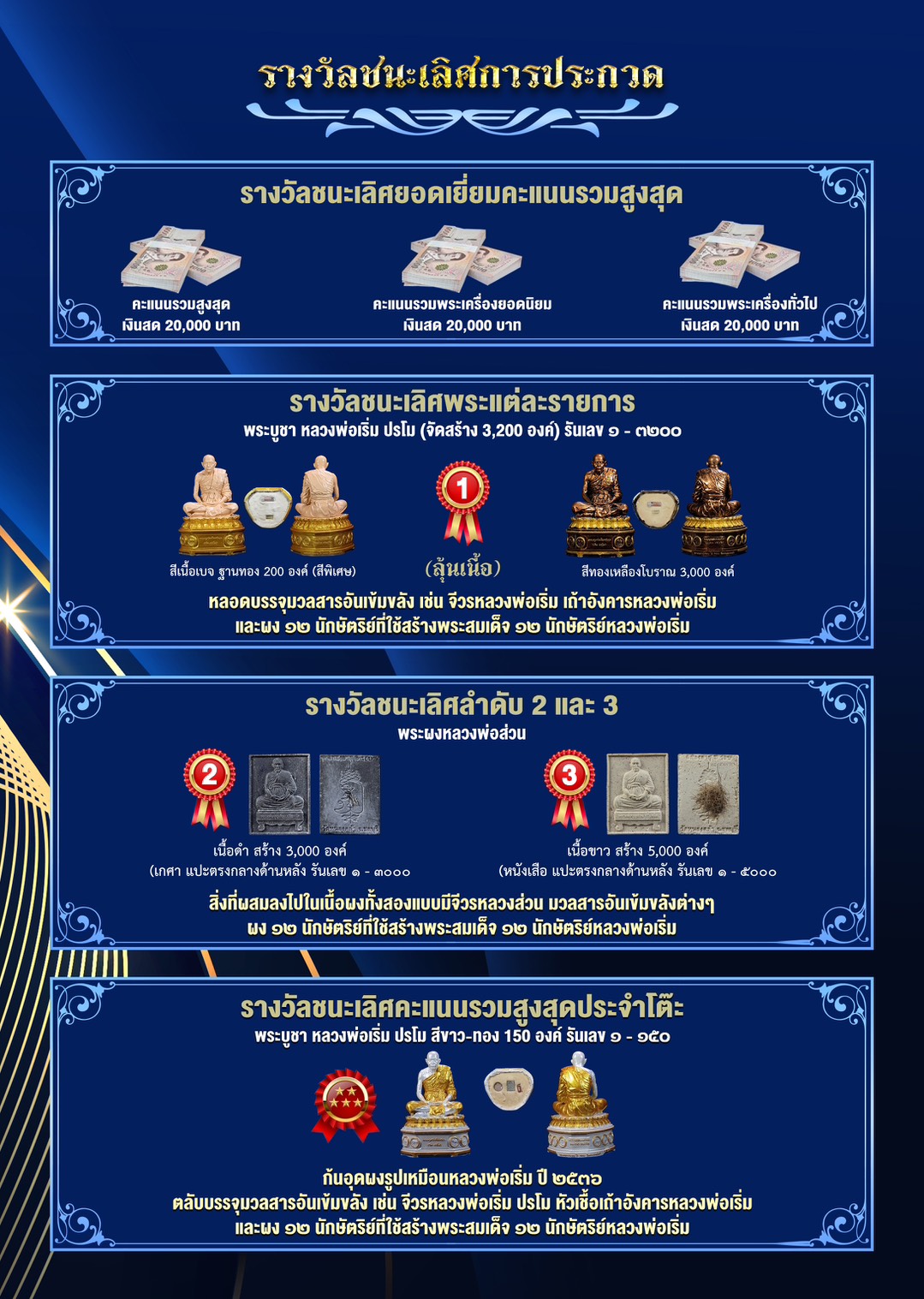 โดยรางวัลชนะเลิศยอดเยี่ยมคะแนนรวมสูงสุด จะได้รับเงินสด 20,000 บาท รางวัลชนะเลิศคะแนนรวมพระยอดนิยม จะได้รับเงินสด 20,000 บาท รางวัลชนะเลิศคะแนนรวมพระทั่วไป จะได้รับเงินสด 20,000 บาท รางวัลชนะเลิศสูงสุดประจำโต๊ะ จะได้รับ (ลุ้นเนื้อ) พระบูชา หลวงพ่อเริ่ม สีขาว-ทอง (สร้าง 150 องค์) ใต้ฐานบรรจุ พระผงรูปเหมือนหลวงพ่อเริ่ม ปี 2536 ตลับบรรจุมวลสารอันเข้มขลัง