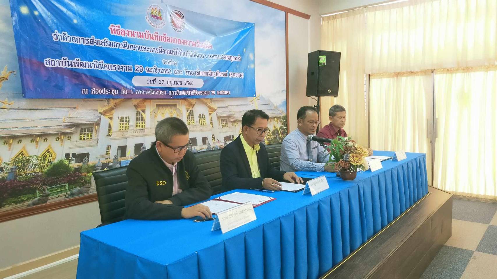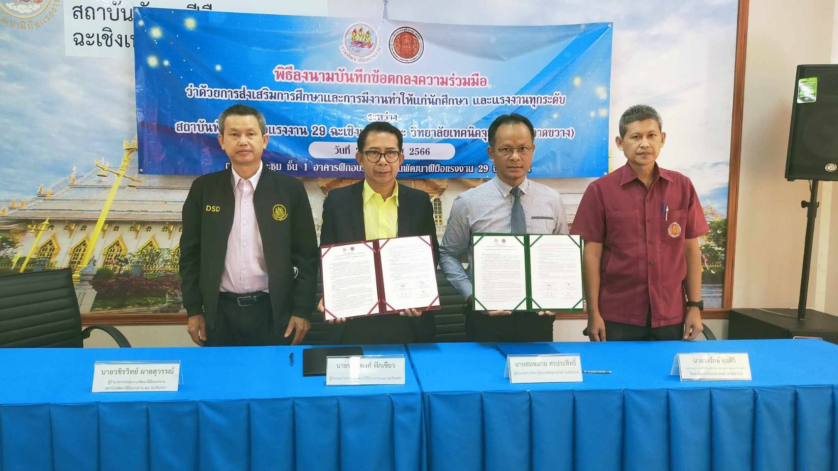วันนี้ 28 มิ.ย. 66 เวลา 16.00 น. นายปฐมพงศ์ ฟักเขียว ผู้อำนวยการสถาบันพัฒนาฝีมือแรงงาน 29 ฉะเชิงเทรา และ นายสมหมาย ศรประสิทธิ์ ผู้อำนวยการวิทยาลัยเทคนิคจุฬาภรณ์ (ลาดขวาง) ร่วมพิธีลงนามบันทึกข้อตกลงความร่วมมือ ว่าด้วยการส่งเสริมการศึกษาและการมีงานทำให้แก่นักศึกษา