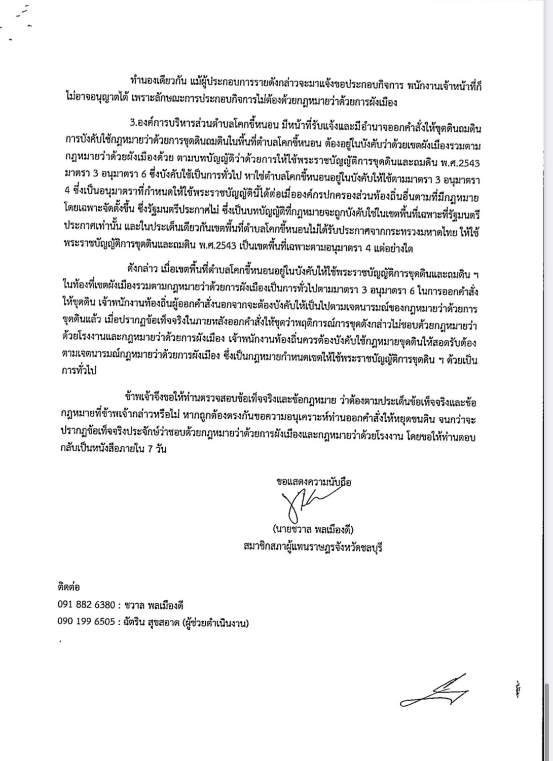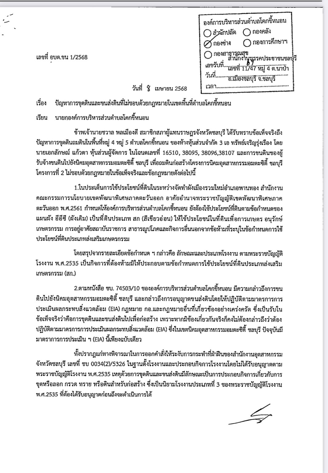 ข้อ 5. กรณีของนายชวาล พลเมืองดี หลังจากวันที่มีคำสั่งดังกล่าววันที่ 20 พ.ค. 2567 แต่ปัจจุบันพบว่า นายชวาล พลเมืองดี ยังทำหน้าที่เป็นสมาชิกสภาผู้แทนราษฎรจังหวัดชลบุรี ทั้งนี้เห็นได้จากเมื่อวันที่ 8 เมษายน 2568 นายชวาล พลเมืองดี ได้มีหนังสือเลขที่ อบต.ชน 1/2568 เรียน นายกองค์การบริหารส่วนตำบลโคกขี้หนอน โดยในท้ายหนังสือดังกล่าว ได้ระบุข้อความส่วนหนึ่งว่า “… ขอความอนุเคราะห์ท่านออกคำสั่งให้หยุดขนดิน จนกว่าจะปรากฏข้อเท็จจริงประจักษ์ว่าชอบด้วยกฎหมายว่าด้วยการผังเมืองและกฎหมายว่าด้วยโรงงาน โดยขอให้ท่านตอบกลับเป็นหนังสือภายใน 7 วัน” ซึ่งหนังสือดังกล่าวลงลายมือชื่อโดยนายชวาล พลเมืองดี สมาชิกสภาผู้แทนราษฎรจังหวัดราชบุรี