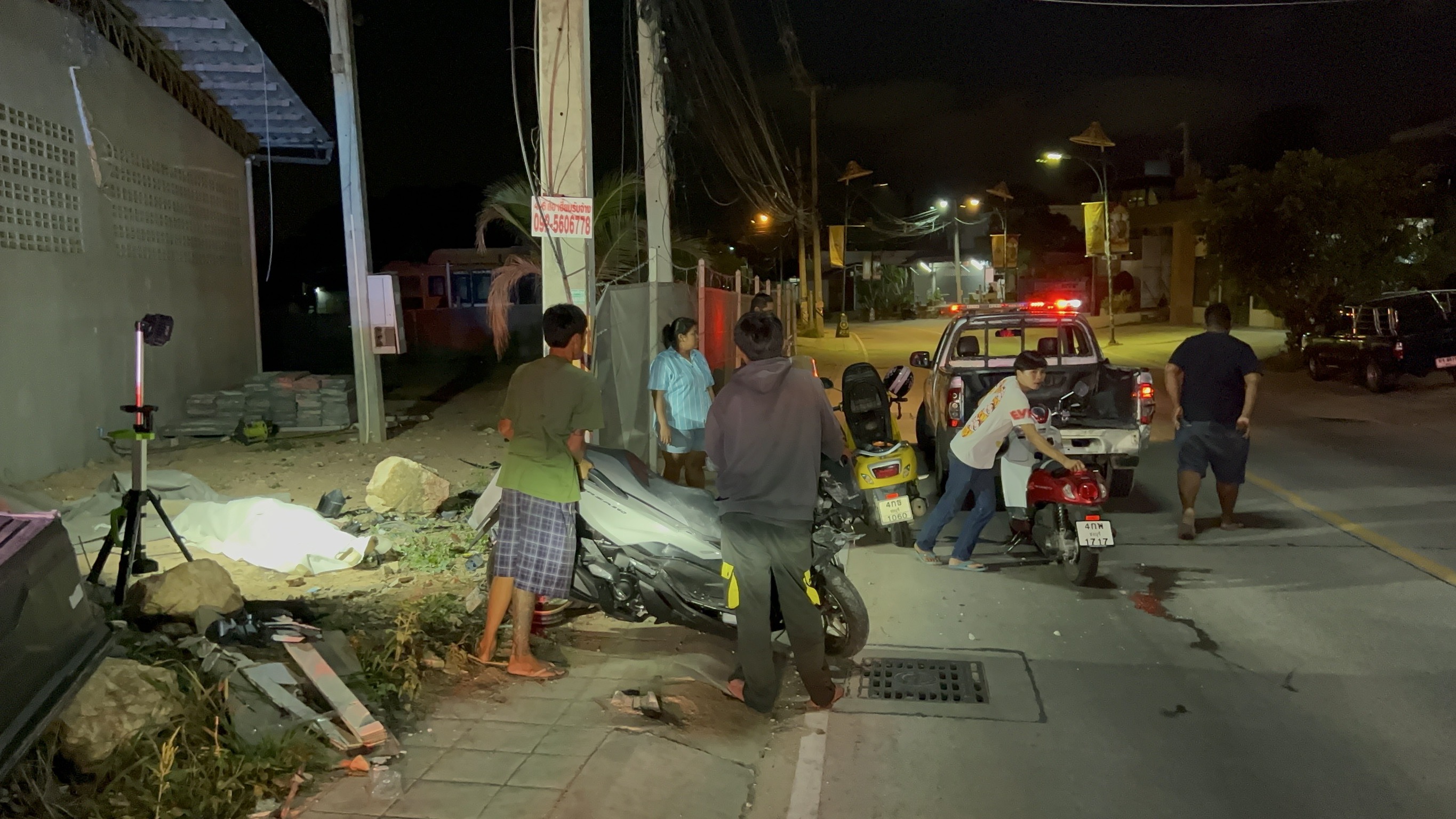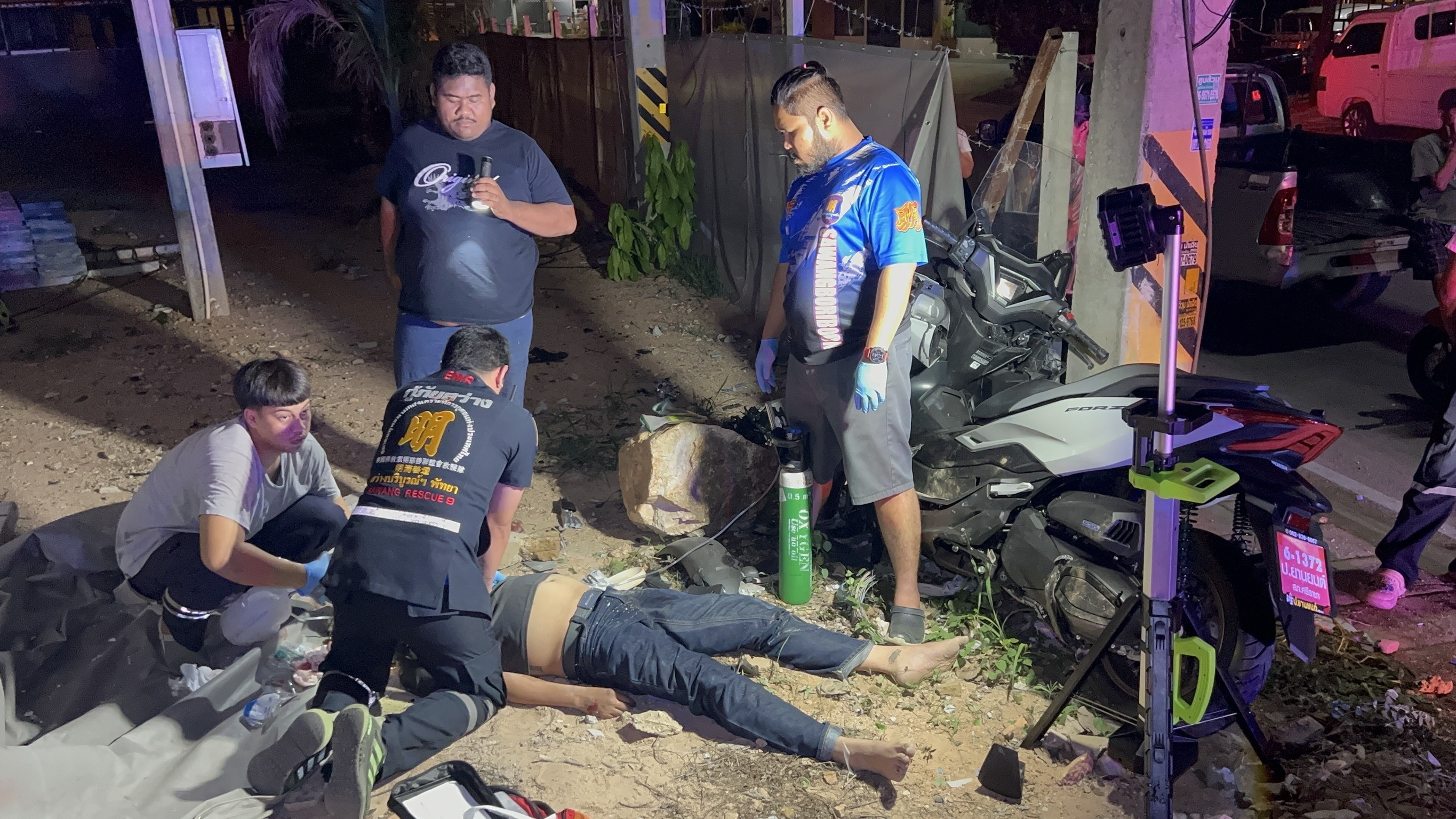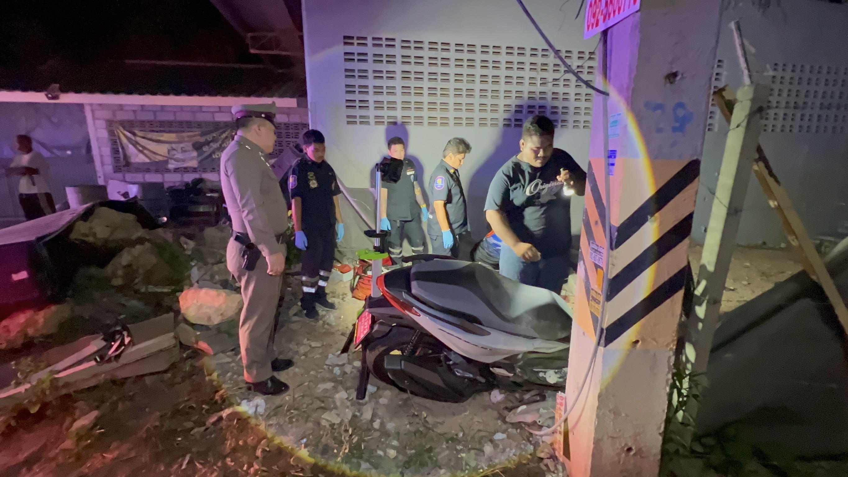 ที่เกิดเหตุมีชาวบ้านออกมาดูเหตุการณ์เป็นจำนวนมาก พบร่างผู้ชายอายุประมาณ 25-35 ปี ไม่พบเอกสารแสดงตัวบุคคล สวมเสื้อยืดสีดำ กางเกงยีนขายาว ได้รับบาดเจ็บนอนจมกองเลือด ในสภาพคอหัก เจ้าหน้าที่กู้ภัยฯปฐมพยาบาลเบื้องต้น ปั้มหัวใจเพื่อยื้อชีวิต แต่ผู้บาดเจ็บทนความบาดเจ็บไม่ไหว จึวเสียชีวิตในเวลาต่อมา ที่โคนเสาไฟฟ้าแรงสูงพบรถจยย.ยี่ห้อ ฮอนด้า ฟอซ่า สีเทา สภ.ศรีราชา พุ่งชนได้รับความเสียหายยับเยิน
