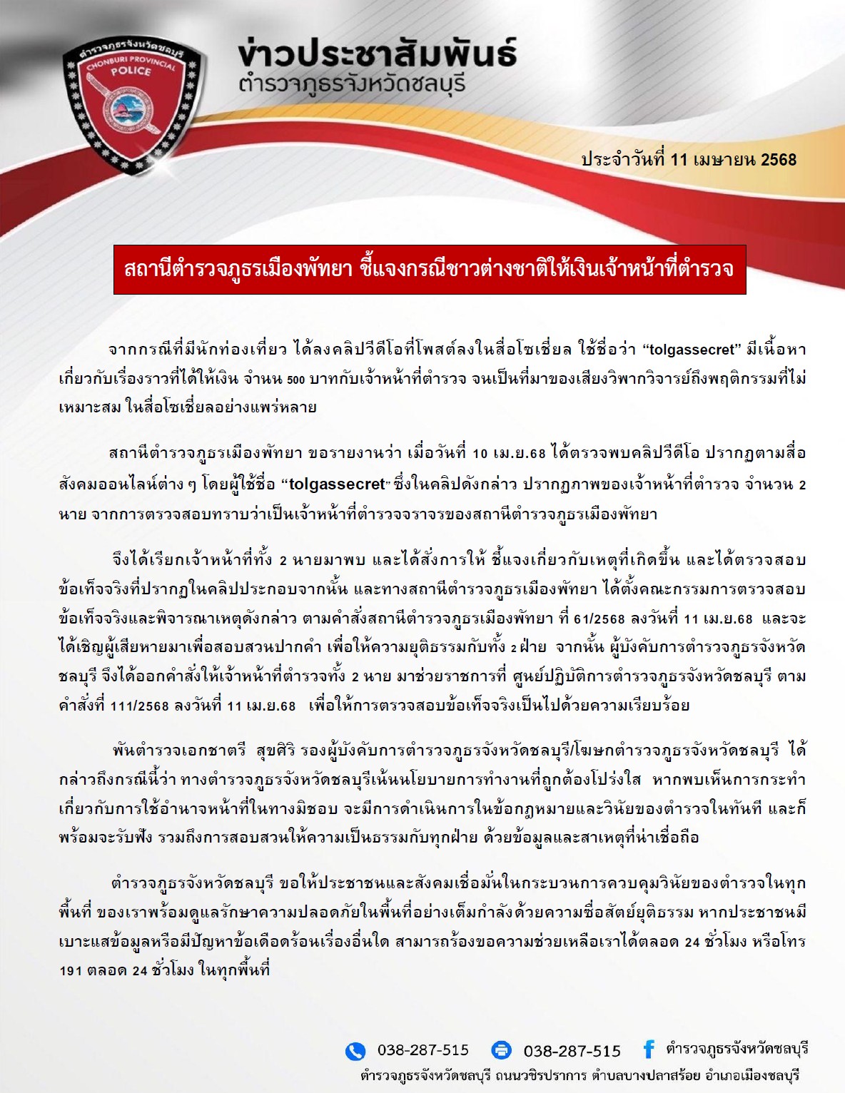 ล่าสุดวันที่ 11 เม.ย.68 ทางสถานนีตำรวจภูธรจังหวัดชลบุรี ได้ทำหนังสือชี้แจงประชาสัมพันธ์ว่า ทางด้านสถานีตำรวจภูธรเมืองพัทยา นำโดย พ.ต.อ.เอนก สระทองอยู่ ผกก.สภ.เมืองพัทยา ได้รายงานมาว่า เมื่อวันที่ 10 เม.ย.68 ได้ตรวจพบคลิปวีดีโอ ปรากฏตามสื่อสังคมออนไลน์ต่าง ๆ โดยผู้ใช้ชื่อ “tolgassecret“ ซึ่งในคลิปดังกล่าว ปรากฏภาพของเจ้าหน้าที่ตำรวจ จำนวน 2 นาย