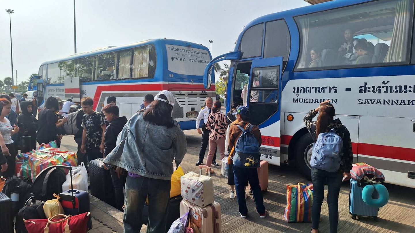 12 04 68 บรรยากาศช่วงเช้าของวันนี้ ที่ด่านพรมแดนสะพานมิตรภาพไทย-ลาว แห่งที่ 2 จังหวัดมุกดาหาร พ.ต.อ.พิทักษ์พงษ์ เจริญกุล ผกก.ตรวจคนเข้าเมืองจังหวัดมุกดาหาร สั่งการให้ พ.ต.ท.ฎการ เข็มพิลา รอง ผกก.ตม.จ.มุกดาหาร พ.ต.ท. จตุพล ยันต์นาวา รอง ผกก.ตม.จ.มุกดาหาร ให้อำนวยความสะดวกให้กับแรงงานชาวลาวที่เข้ามาทำงานในประเทศไทย เดินทางเพื่อกลับไปเยี่ยมบ้าน และฉลองสงกรานต์กับครอบครัว ที่ถือเป็นปีใหม่ของชาว สปป.ลาว โดยคาดว่าในแต่ละวันจะมีจำนวนหลายพันคน ได้เข้าแถวให้เจ้าหน้าที่ตรวจคนเข้าเมืองจังหวัดมุกดาหาร ตรวจเอกสารต่างๆก่อนขึ้นรถทัวร์โดยสารข้ามไปยังแขวงสะหวันนะเขต สปป.ลาว