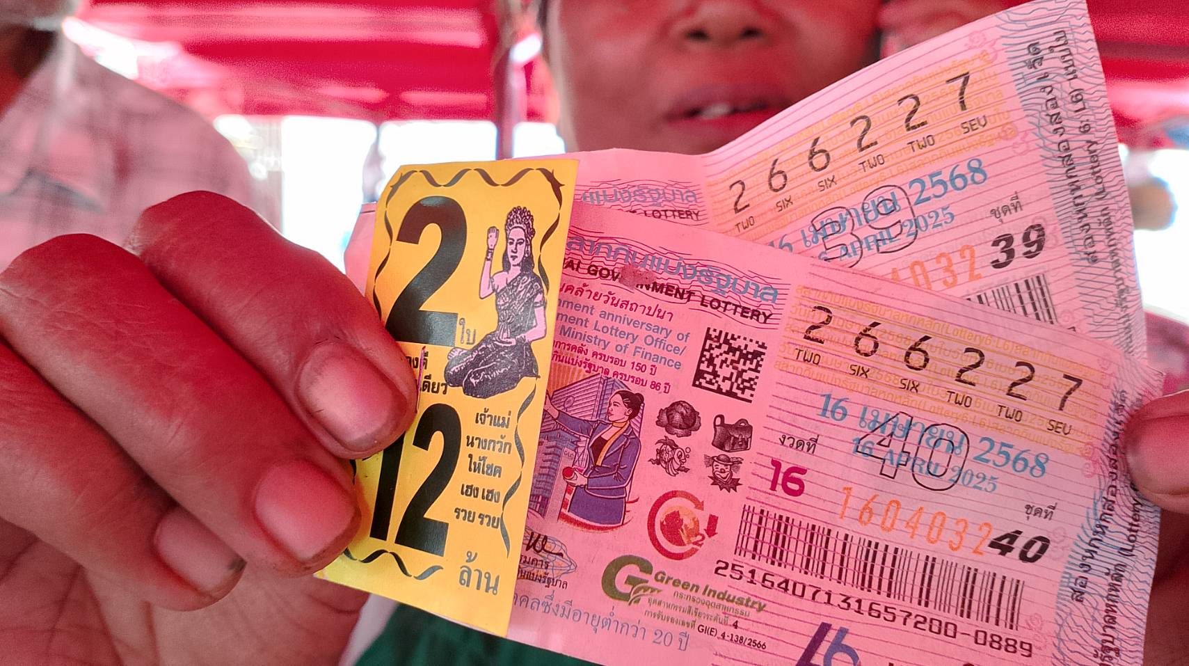 เมื่อเวลา16.30น.(16เมษายน2568)ที่ตลาดนัดเสาสูง พื้นที่หมู่6 ตำบลบ่อวิน อำเภอศรีราชา ผู้สื่อข่าวได้ทราบว่าพ่อค้าแม่ค้าขายผักสองผัวเมียดวงเฮงถูกรางวัลที่1จำนวน2ใบ 12ล้านบาท จึงเดินทางไปตรวจสอบพบว่าผู้ถูกรางวัลชื่อนายจันทร์แดง สมหวัง อายุ66ปีและนางแดง บุญไทยสง อายุ64 ปี ทั้งสองตายายเป็นพ่อค้า-แม่ค้า ขายผักในตลาดนัดเสาสูงมากว่า 20 ปีแล้ว โดยสลากกินแบ่งที่ซื้อมาจากพ่อค้าที่มาขายหน้าตลาดนัดเสาสูงก่อนหวยออก โดยนายจันทร์แดงได้บอกกับพ่อค้าขายหวยว่าถ้ามีเลขท้าย 227ให้นำมาให้1คู่ โดยคนขายได้หยิบหมายเลข266227 มาให้ทำให้ตนโชคดีถูกรางวัลที่1 ในครั้งนี้ 2 ใบรับเงิน12ล้านบาท