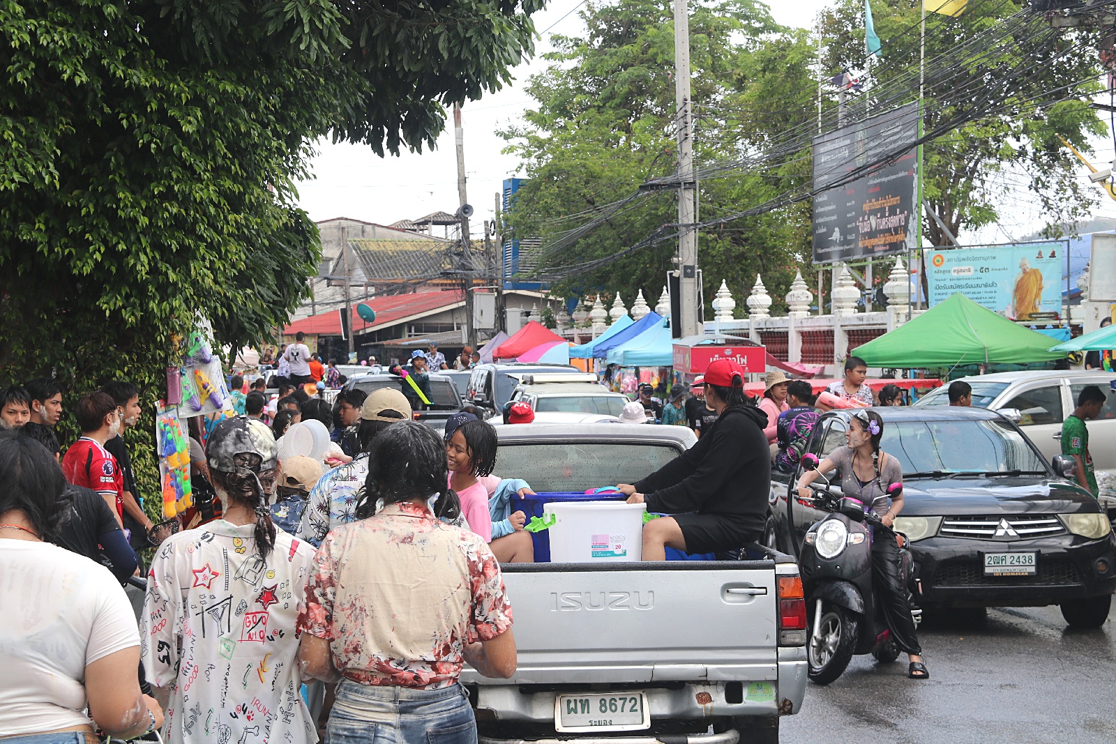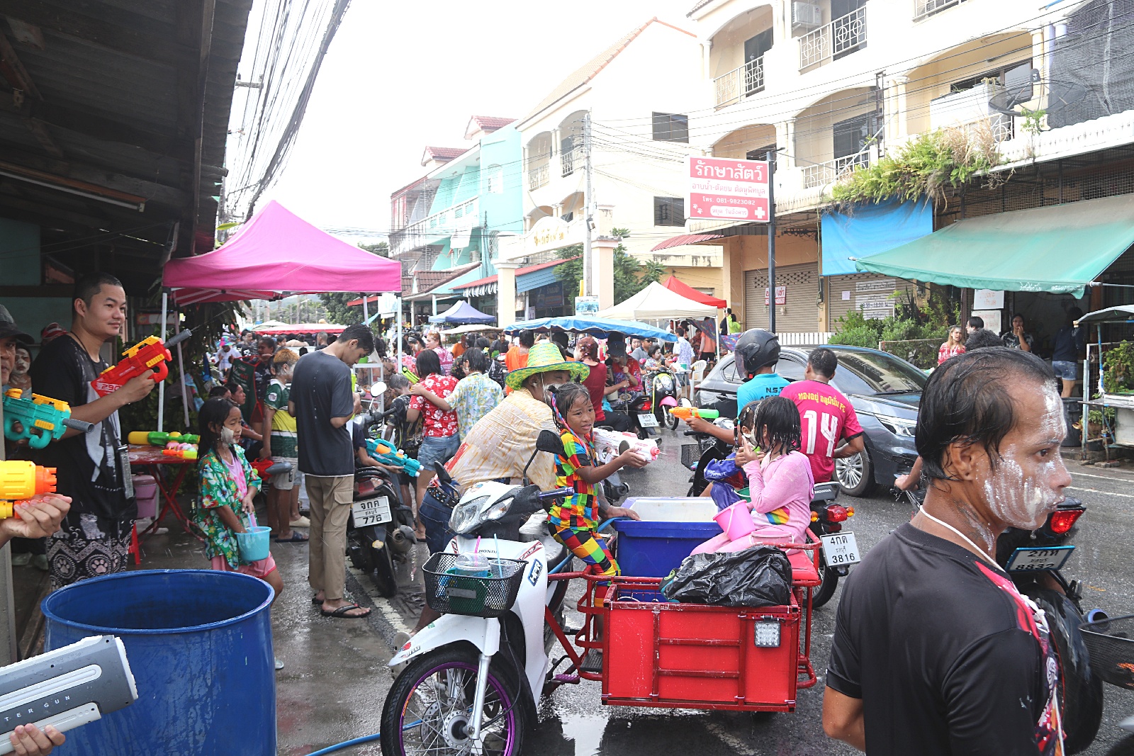 บรรยากาศการเล่นสงกรานต์ ในอำเภอสัตหีบ โดยวันนี้ เป็นวันไหลของวัดป่ายุบ ซอยบ่อนไก่ หมู่ที่ 5 ตำบลสัตหีบ อำเภอสัตหีบ จังหวัดชลบุรี พ.ต.อ.คมสรร คำตุ่นแก้ว ผกก.สภ.สัตหีบ ได้สั่งการให้ชุดป้องกันและปราบปราม และชุดสืบสวน กว่า 20 นาย ลงพื้นที่ดูแลความปลอดภัย ตลอดทั้งซอย เพื่อป้องกันเหตุทะเลาะวิวาท และดูแลความปลอดภัยให้กับประชาชนและนักท่องเที่ยว ตลอดทั้งงาน