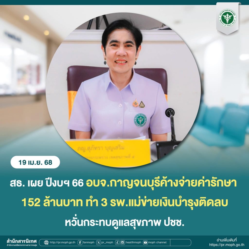 นพ.ประวัติ กิจธรรมกูลนิจ นายก อบจ.กาญจนบุรี เปิดเผยว่า จากการตรวจสอบยอดค้างชำระค่ารักษากับโรงพยาบาลแม่ข่ายในพื้นที่ทั้ง 12 อำเภอ พบว่ายอดล่าสุด ณ วันที่ 21 เม.ย. 2568 อยู่ที่ 47.9 ล้านบาท ไม่ใช่ 152 ล้านบาทตามที่กระทรวงสาธารณสุข (สธ.) เคยระบุ