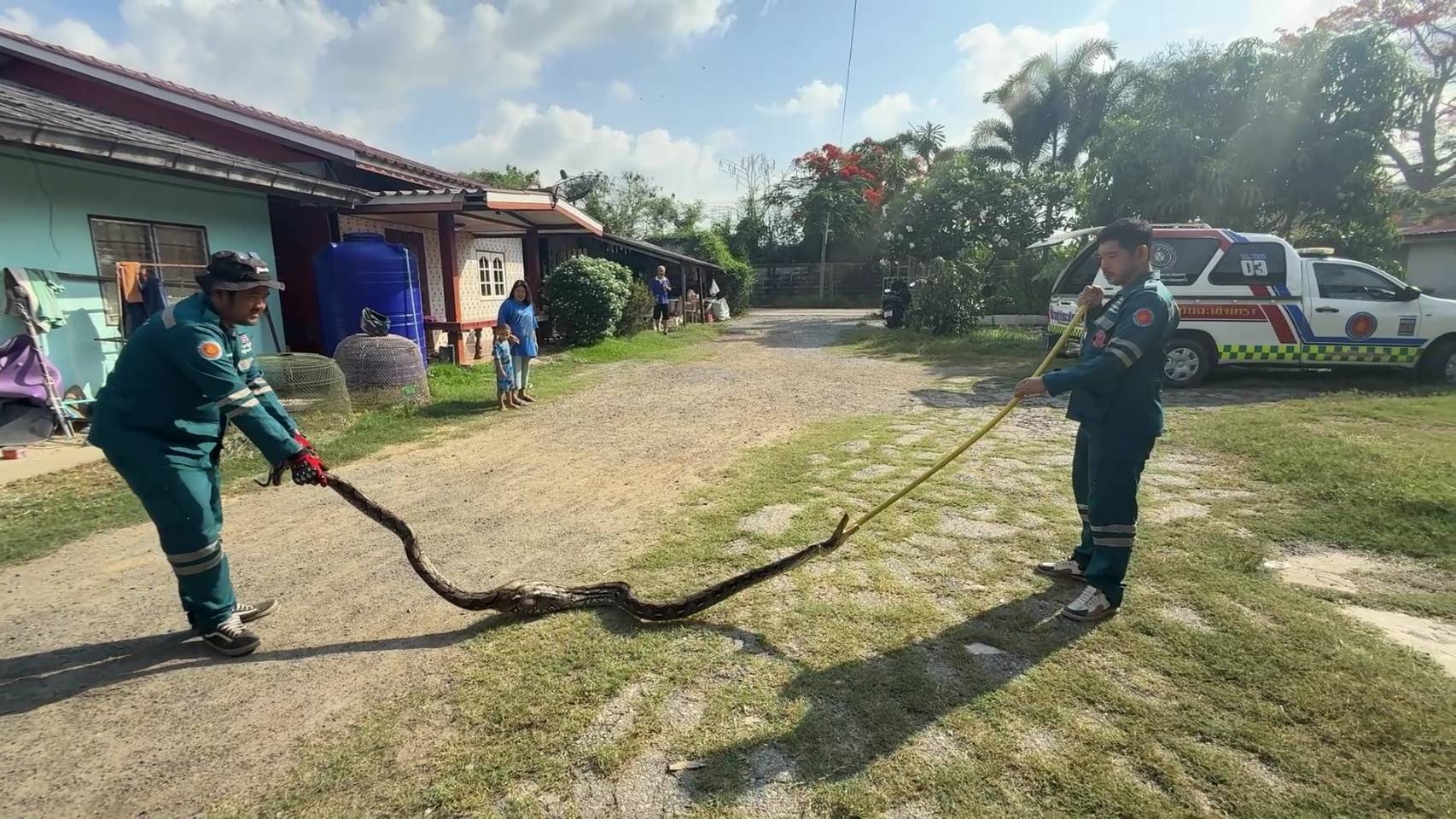 เมื่อไปถึงพบว่าน.ส.บัวเผื่อน เจ้าของบ้านนั่งเฝ้างูอยู่ กลัวงูตัวดังกล่าวจะเลื้อยหนีหายก่อนที่เจ้าหน้าที่จะมาจับ โดยข้างสุ่มไก่ชน พบหัวงูเหลือมโผล่ออกมา ตรวจสอบพบว่าบริเวณช่วงท้องมีขนาดใหญ่ หลังจากกินไก่ชนภายในสุ่มไป แล้วลำตัวติด ไม่สามารถเลื้อยออกมาได้ เจ้าหน้าที่กู้ภัยจังใช้อุปกรณ์ที่เตรียมมา คล้องเข้าไปที่บริเวณช่วงคอ ก่อนจะดึง แต่งูเหลือมดัวกล่าวมีขนาดใหญ่ พยายามยื้อรัดสิ่งของที่อยู่ใกล้ฝืนแรงเจ้าหน้าที่ กว่าเจ้าหน้าที่กู้ภัยจะนำตัวงูเหลือมออกมาด้านนอกได้ ต้องใช้แรงดึงเป็นอย่างมาก ซึ่งหลังนำออกมาด้านนอกบ้านแล้ว เจ้าหน้าที่กู้ภัยได้นำใส่ถุงกระสอบ นำขึ้นหลังรถ เพื่อนำไปปล่อยในป่าห่างไกลชุมชนกลับคืนสู่ธรรมชาติต่อไป