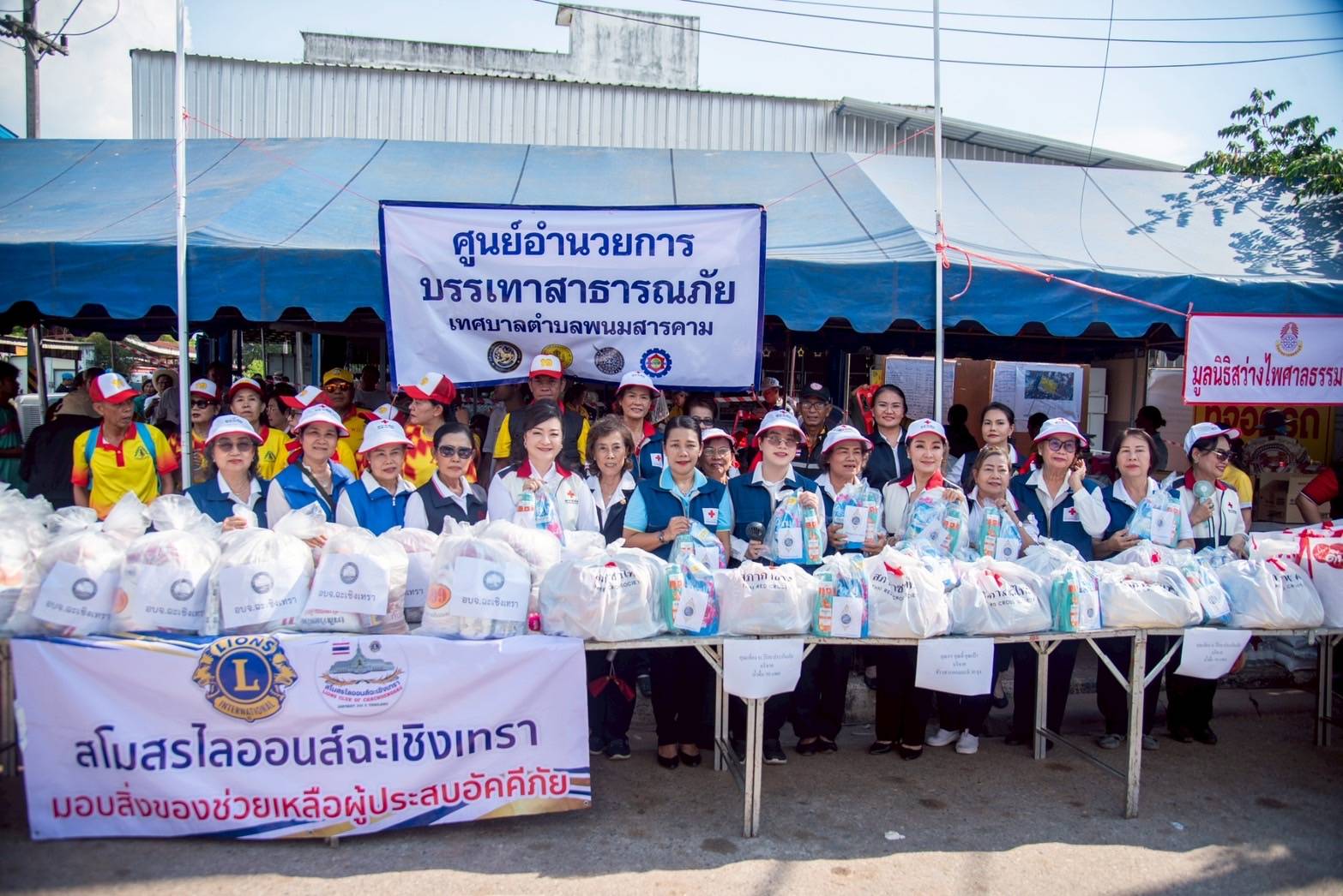 ซึ่งในขณะที่กำลังมอบสิ่งของช่วยเหลือประชาชนอยู่นั้น ได้เกิดเหตุเพลิงไหม้บ้านที่อยู่อาศัยใกล้ตลาดพนมสารคาม (ซอยจุฑาทิพย์2) ซึ่งห่างจากจุดมอบของช่วยเหลือเพียงแค่ 50 เมตร ทำให้เกิดความชุลมุน เจ้าหน้าที่ต่างช่วยกันเข้าไปดับเพลิงที่กำลังลุกไหม้ ซึ่งทางด้านผู้ว่าราชการจังหวัดฉะเชิงเทรา นายอำเภอพนมสารคาม ผู้บัญชาการตำรวจภูธรฉะเชิงเทรา หัวหน้าป้องกันและบรรเทาสาธารณภัยฉะเชิงเทรา ก็ได้ไปบัญชาการระงับเหตุในครั้งนี้อย่างใกล้ชิด โดยเจ้าหน้าที่ดับเพลิงและมีรถน้ำดับเพลิงจำนวน 6 คัน สามารถระงับเพลิงได้เมื่อประมาณ เวลา 15.30 น.