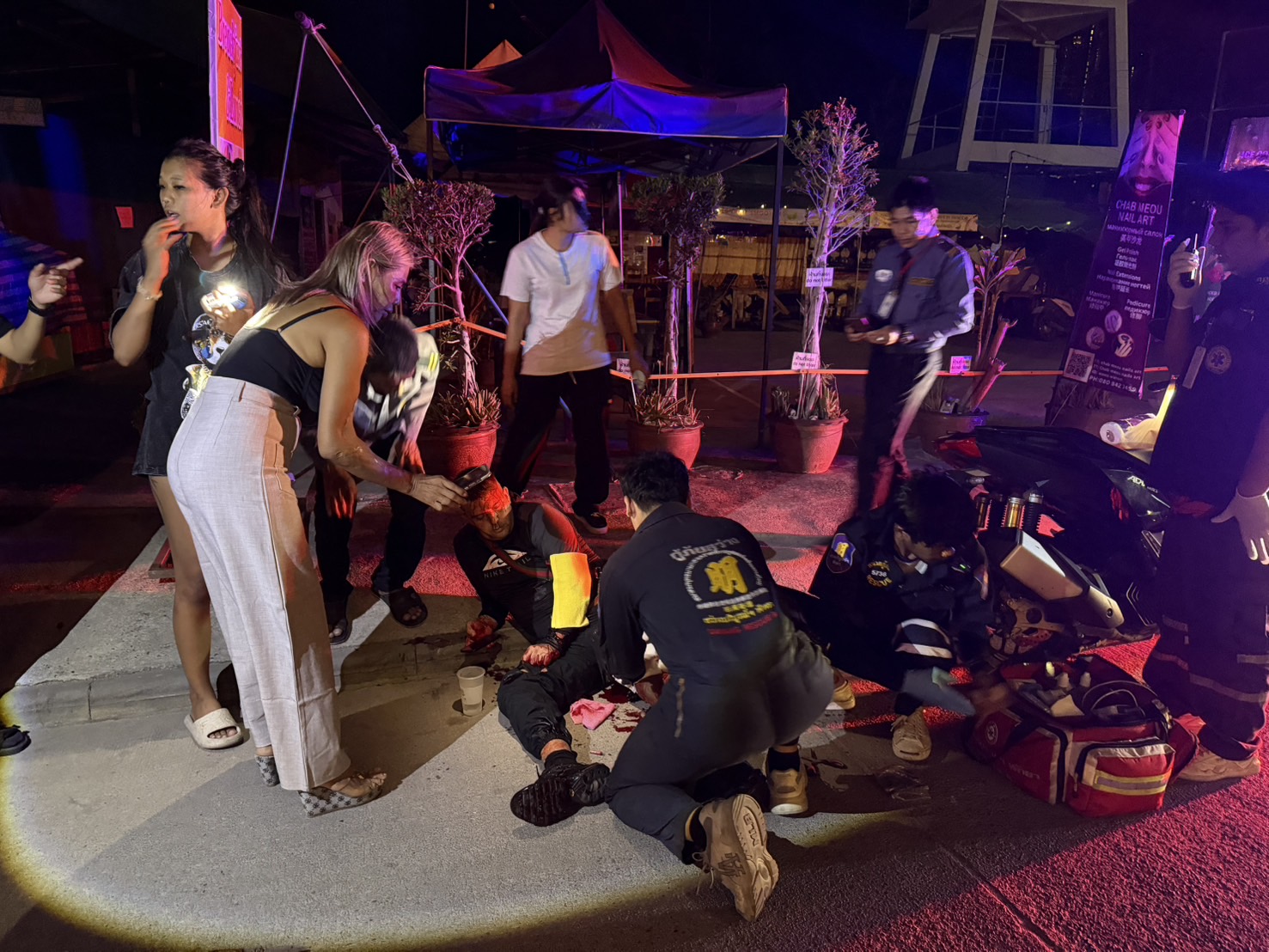 ที่เกิดเหตุพบMR.SCOTT THOMAS LACY อายุ 34 ปี สัญชาติไอร์แลนด์ ได้รับบาดเจ็บถูก ของมีคมฟันเข้าที่แขนซ้าย หน้าท้อง และขาทั้งสองข้าง นอนจมกองเลือดอยู่ริมถนน ข้างรถจักรยานยนต์ยี่ห้อฮอนด้า ADV 150 หมายเลขทะเบียนป้ายแดง 1-6588 สภ.เมืองพัทยา บนพื้นถนนยังพบมีดพับตกอยู่ 1 เล่ม เจ้าหน้าที่ตำรวจจึงเก็บไว้เป็นหลักฐาน ซึ่งเจ้าหน้าที่กู้ภัยฯ ให้การช่วยเหลือปฐมพยาบาลเบื้องต้นผู้ได้รับบาดเจ็บอาการสาหัส ก่อนเคลื่อนย้ายส่งโรงพยาบาลอย่างเร่งด่วน