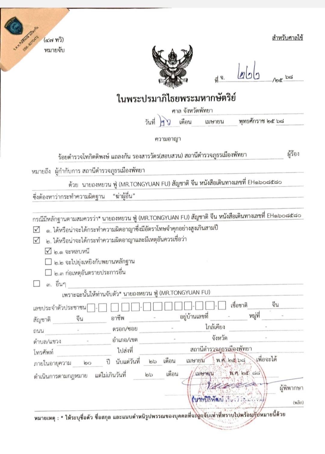 ความคืบหน้าล่าสุด ตำรวจตรวจคนเข้าเมือง ประจำท่าอากาศยานนานาชาติสุวรรณภูมิ จ.สมุทรปราการ ได้ควบคุมตัว นายตงหยวน ฟู่ ( Mr.Tongyung Fu ) อายุ 42 ปี ชาวจีน ขณะกำลังเดินทางหนีออกนอกประเทศไทย กลับ มณฑลคุณหมิง ประเทศจีน และอยู่ในระหว่างควบคุมตัวกลับมาสอบสวนที่ สภ.เมืองพัทยา ขณะที่ศาลจังหวัดพัทยา มีการอนุมัติออกหมายจับ เลขที่ 222/2568 ในข้อกล่าวหา ฐานความผิดฆ่าผู้อื่น