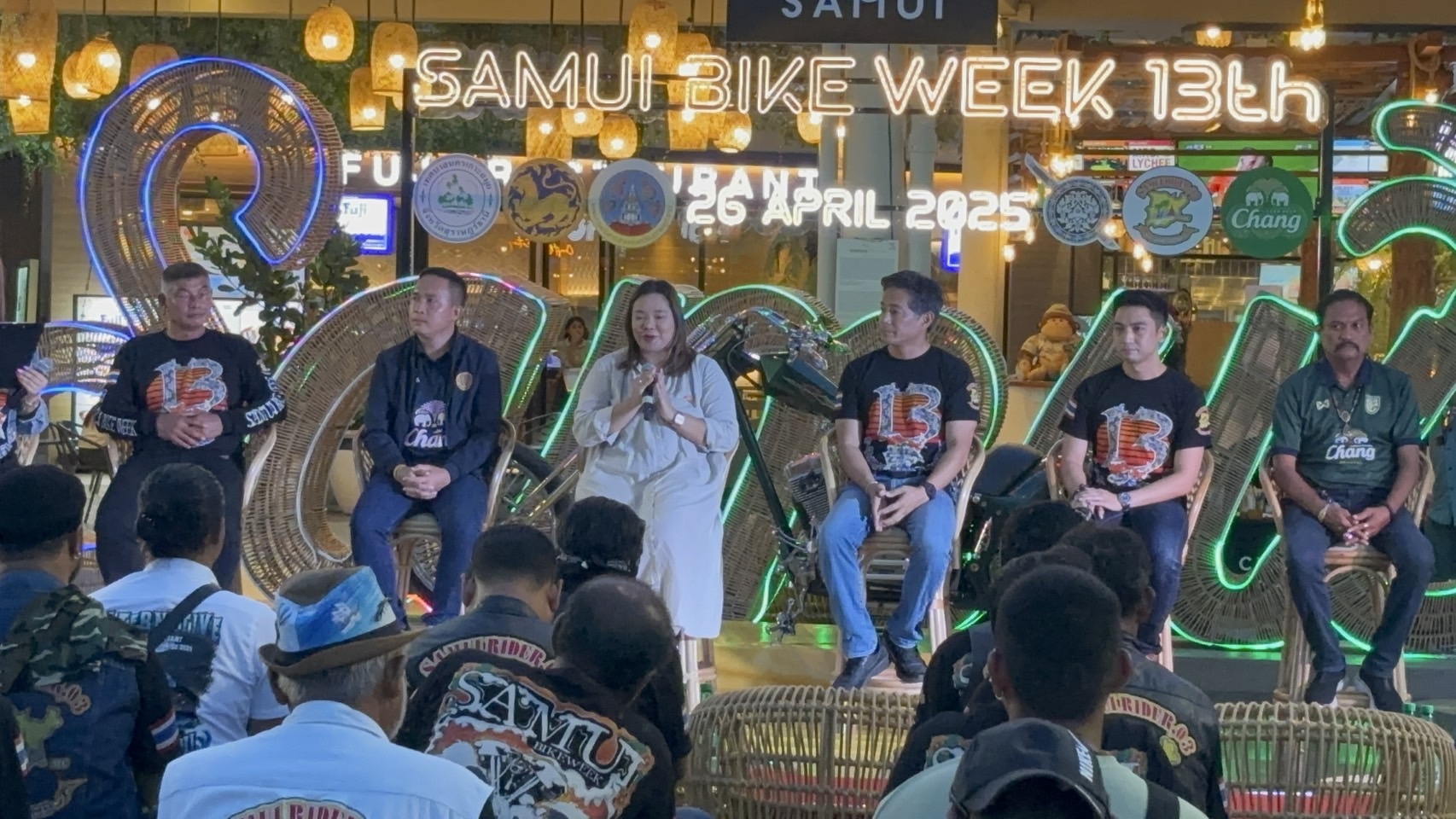 วันที่ 26 เม.ย. 2568 ผู้สื่อข่าวรายงานว่า ที่ศูนย์การค้าเซ็นทรัลสมุย หมู่ 2 ตำบลบ่อผุด อำเภอเกาะสมุย จังหวัดสุราษฎร์ธานี กลุ่มพี่น้องชาวไบเกอร์บนเกาะสมุย เกือบ 200 คัน รวมถึงหน่วยงานที่เกี่ยวข้องทั้งภาครัฐและภาคเอกชน ร่วมกันจัดแถลงข่าวการเตรียมความพร้อมจัดงานสมุยไบค์วีค ครั้งนี้ โดย นายจิรภัทร์ ชูจันทร์ ปลัดอำเภอเกาะสมุย ร.ต.ท.ดร.พงษ์ศักดิ์ บุญมาศ ประธานชมรมสมุยไบค์วีค และ ประธานจัดงานสมุยไบค์วิค ครั้งที่ 13 ในครั้งนี้ นางสาวณอร สุวรรณธีรกิจ รอง ผอ.ททท.แห่งประเทศไทย สำนักงานเกาะสมุย นายอัครา นาคบัลลังก์ GM ศูนย์การค้าเซ็ลทรัลสมุย นายกิตติสตีเว่น ธาระพุทธิ เลขาสมาคมส่งเสริมการท่องเที่ยวเกาะสมุย รวมถึงทุกภาคส่วนที่เกี่ยวข้องเข้าร่วมและสมาชิกชมรมสมุยไบค์เกอร์สมุย โดย ร.ต.ท.ดร.พงษ์ศักดิ์ บุญมาศ ประธานชมรมสมุยไบค์วีค หนึ่งในตัวแทนชาวไบเกอร์บนเกาะสมุย เปิดเผยถึงการจัดงานสมุยไบค์วีค ว่า สำหรับสมุยไบค์วีคครั้งที่ 13 ประจำปี 2568 นี้พวกเรา จัดยิ่งใหญ่กว่าปีที่ผ่านมา ในนามชาวสมุยในนามไบค์เกอร์สมุย พี่น้องนักขับขี่รถชาวสมุยเราจัดกิจกรรม ท่องเที่ยวด้วยรถจักรยานยนต์เป็นครั้งที่ 13 ก่อนหน้านี้มีการว่างเว้นไปในช่วงโควิด ซึ่งจริงๆ แล้ว จัดมาประมาณ 20 ปี ทุกครั้งได้รับการตอบรับจากนักท่องเที่ยวทั่วประเทศไม่ว่าจะเป็นเพื่อนบ้านของเรา มาเลเซีย สิงคโปร์ อินโดนีเซีย เดินทางมาร่วมกับพวกเราที่สมุยสำหรับปีนี้จะมีการจัดกิจกรรมในวันที่ 2-3 พฤษภาคมนี้ และ มีโปรแกรมในการนำเพื่อนๆกลุ่มนักท่องเที่ยวไบเกอร์ ไปเที่ยวชมในสถานที่ท่องเที่ยวของชุมชนเพื่อเป็นการโชว์ศักยภาพของสมุย ซึ่งคาดว่าในปีนี้ จะมีรถจักรยานยนต์ขนาดใหญ่ กว่า 5,000 คันมาชุมนุมกันที่งาน สมุยไบค์วิคครั้งนี้