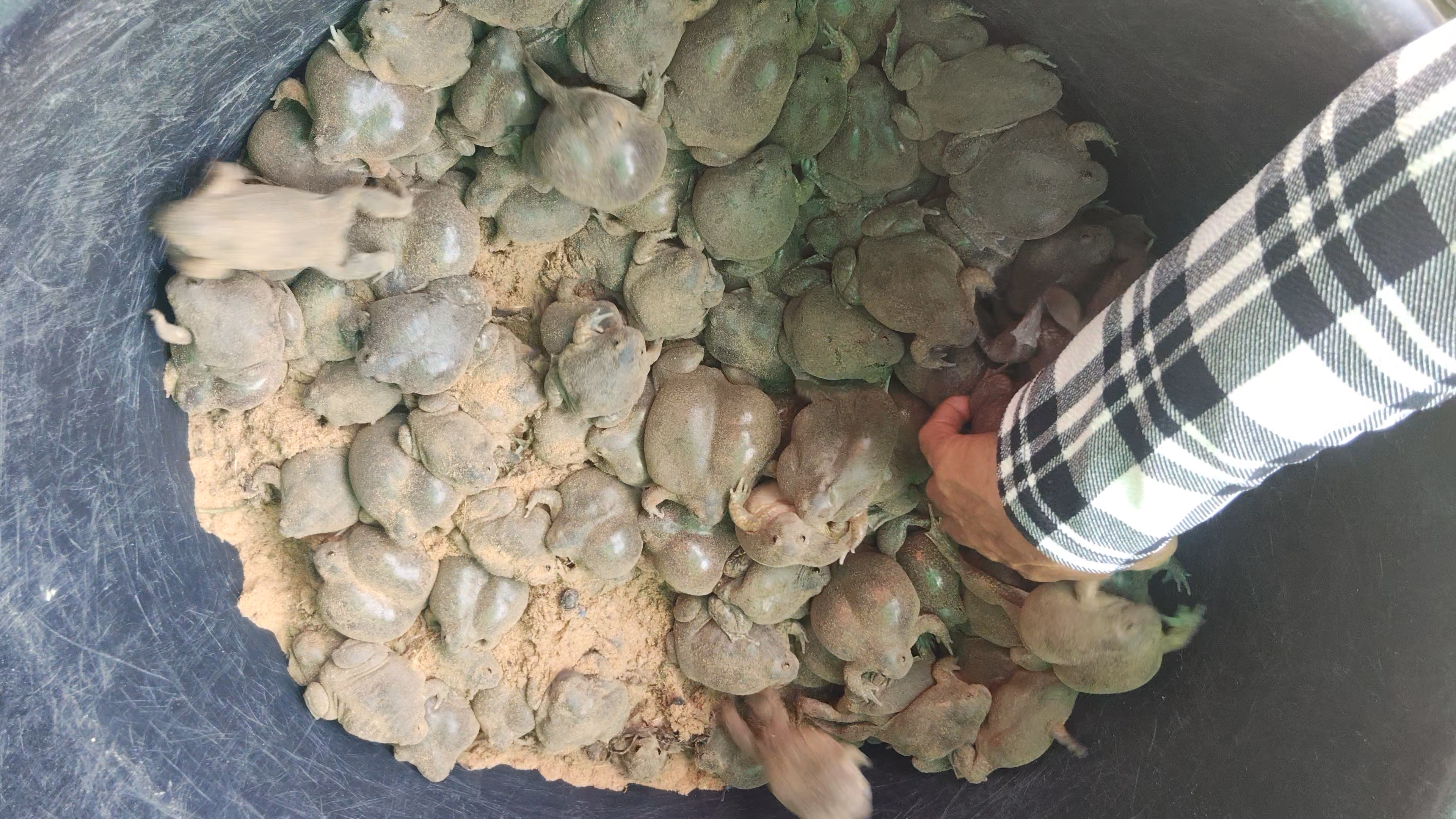 วันที่ 30 เม.ย.68 ผู้สื่อข่าวรายงานว่า หลังจากเมื่อวานนี้ในพื้นที่อำเภอชายแดนไทย-กัมพูชา ด้าน จ.สุรินทร์ เกิดฝนตกหนัก พบว่าชาวบ้านต่างพากันออกจับอึ่งอ่างมาไว้บริโภคและขายกันเป็นจำนวนมาก โดยเฉพาะที่บริเวณด้านหลังตลาดการค้าชายแดนช่องจอม ซึ่งเป็นพื้นที่ที่ทางตลาดการค้าชายแดนช่องจอม จัดพื้นที่ให้ประชาชนได้ขายพืชผักของป่าต่างๆเป็นการชั่วคราว ที่พบว่ามีพ่อค้าแม่ค้า ต่างนำอึ่งอ่างมาขายเป็นจำนวนมาก โดยมีราคาที่แตกต่างกันไป อาทิ อึ่งอ่างไข่ จะขายในราคากิโลกรัมละ 400 บาท ส่วนตัวที่ไม่มีไข่ขาย ก.ก.ละ 200 บาท ส่วนอึ่งอ่างลาย ขาย ก.ก.ละ 150 บาทเท่านั้น ซึ่งอึ่งอ่างไข่ จะได้รับความสนใจและขายดีเป็นพิเศษ แม้จะมีราคาสูงก็ตาม เพราะตัวที่มีไข่ เมื่อนำไปประกอบอาหาร ไม่ว่าจะ ต้มแกง หรือ ย่าง ก็มีรสชาติที่หอมอร่อย มันๆด้วยไข่อึ่ง ถือเป็นอาหารชั้นยอดของชาวอีสาน และหากินได้ปีละครั้ง เฉพาะในช่วงฝนตกใหม่ๆในช่วงต้นฤดูฝนเท่านั้น