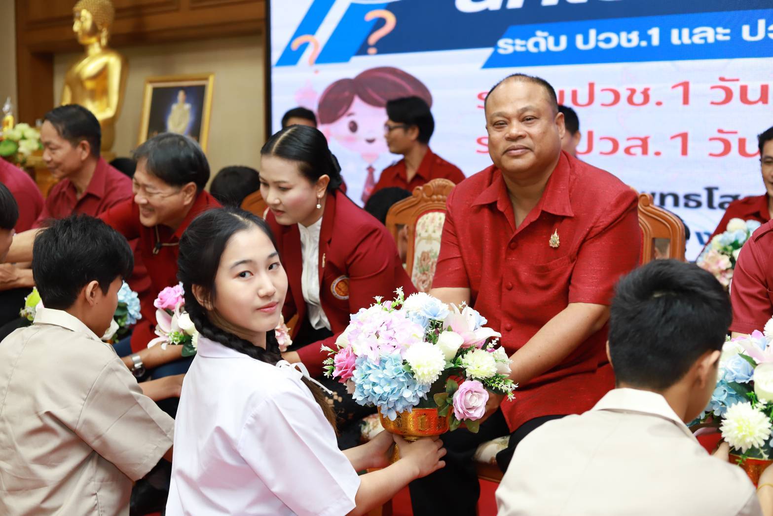 โดยมี นางสาวณัฐรินีย์ สุริวงษ์ (รองผู้อำนวยการฝ่ายบริหารทรัพยากร) นายสุมิตร คชวงษ์ (รองผู้อำนวยการฝ่ายวิชาการ) คณะครูและนักเรียน นักศึกษาเข้าร่วมในพิธี