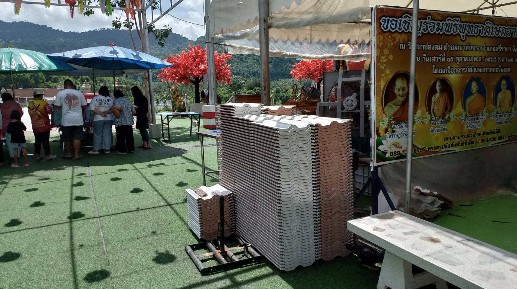 โดยทำบุญกระเบื้องมุงหลังคาศาลาการเปรียญได้ที่บริเวณลานท้าวเวสสุวรรณ หน้าเขาช่องลม อานิสงส์การเป็นเจ้าภาพกระเบื้องมุงหลังคาศาลาการเปรียญ มี 7 ประการ คือ ส่งผลให้สามารถทำงานที่ใหญ่โตได้สำเร็จโดยง่ายไม่มีอุปสรรค จะมีแต่สิ่งดีๆเข้ามาในชีวิต มีอำนาจบารมีบริวารที่ดี มีแต่ความร่มเย็นเป็นสุข ไม่ร้อนกายร้อนใจเหมือนดั่งที่หลังคาคอยคุ้มแดด คุ้มฝน ให้แก่ผู้คนที่มาปฏิบัติธรรม จะไม่มีคนคิดปองร้าย จะไม่ขาดแคลนปัจจัยสี่ เกิดชาติไหนมีแต่คนนับหน้าถือตา และสุดท้าย กิจการก็จะเจริญรุ่งเรืองก้าวหน้า