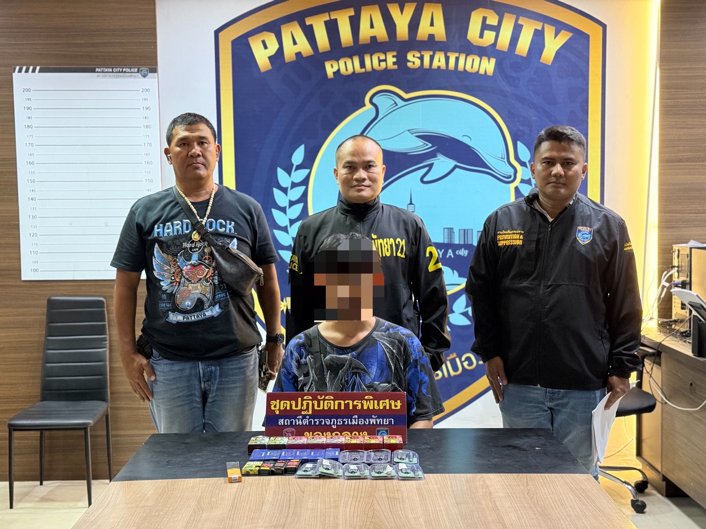 สวป.สภ.เมืองพัทยา พร้อมเจ้าพนักงานตำรวจชุดปฏิบัติการพิเศษ (ป.พิเศษ) สภ.เมืองพัทยา ร่วมกันจับกุมตัวนายเกริกชัย ขำเมืองน้อย อายุ 29 ปี