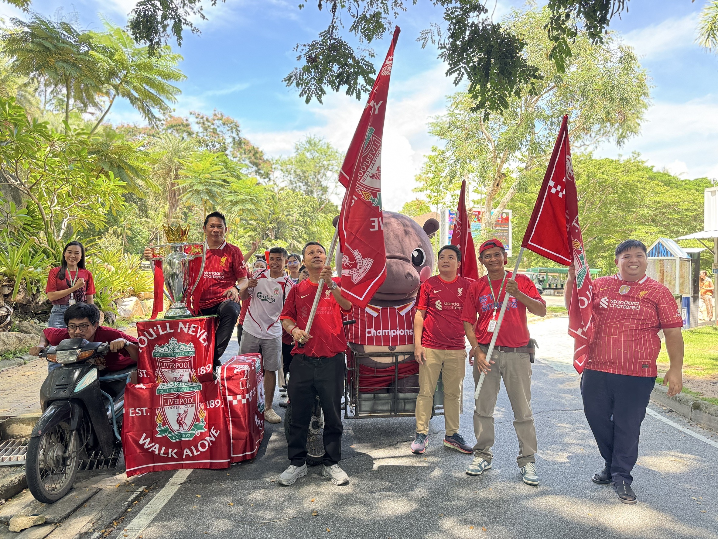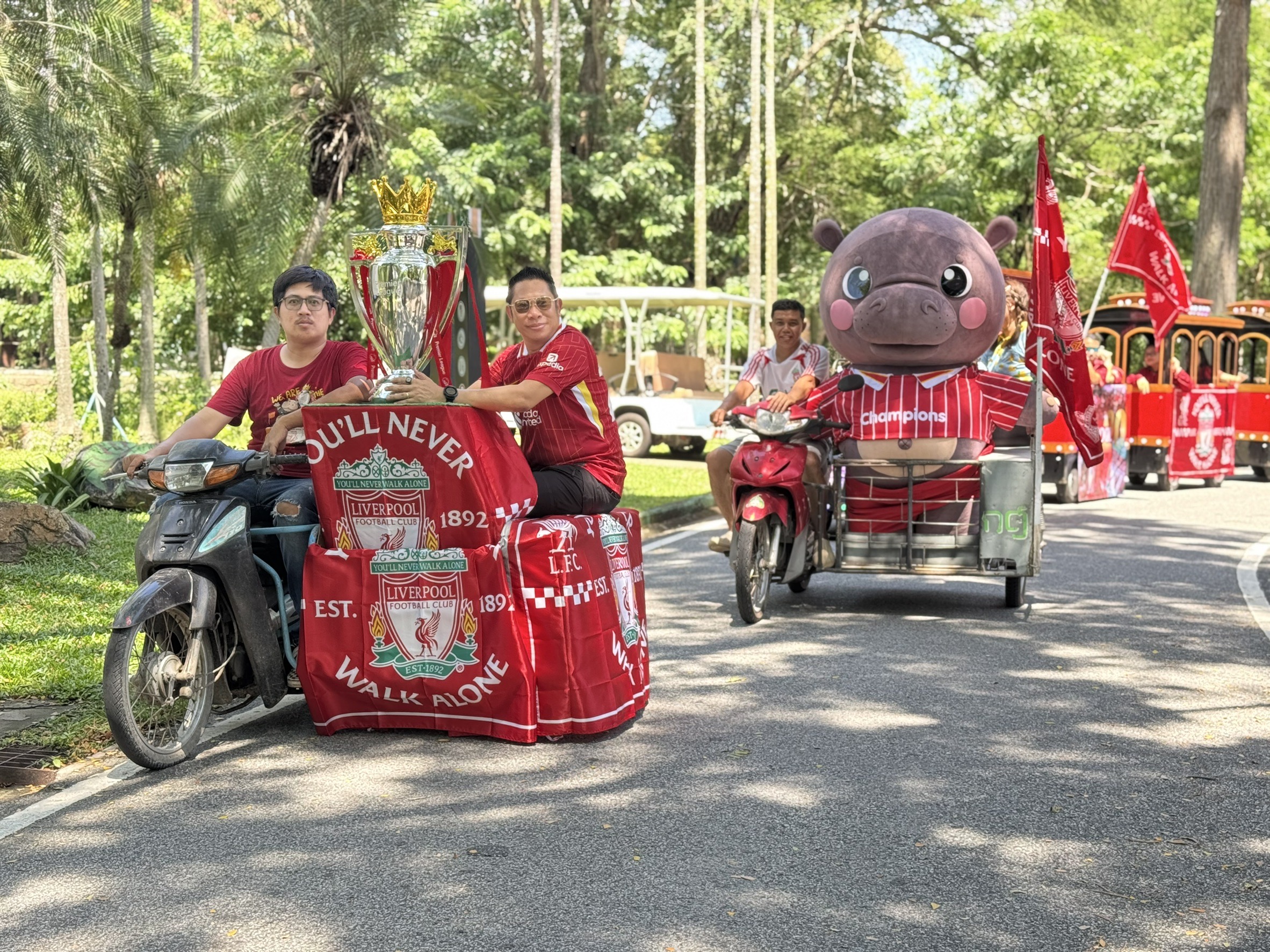 งานนี้ไม่ได้มีแค่เดินขบวนธรรมดา แต่ยังมีกิจกรรมถ่ายภาพกับมาสคอตในชุดลิเวอร์พูล โดยเฉพาะมาสคอตขวัญใจเด็ก ๆ อย่าง “ฮิปโปฯ หมูเด้ง” ที่มาร่วมสร้างสีสันในขบวนแห่ด้วยลีลาสุดกวนและชุดแข่งหงส์แดงสุดเท่ เรียกเสียงฮือฮาและคำขอถ่ายรูปตลอดทาง