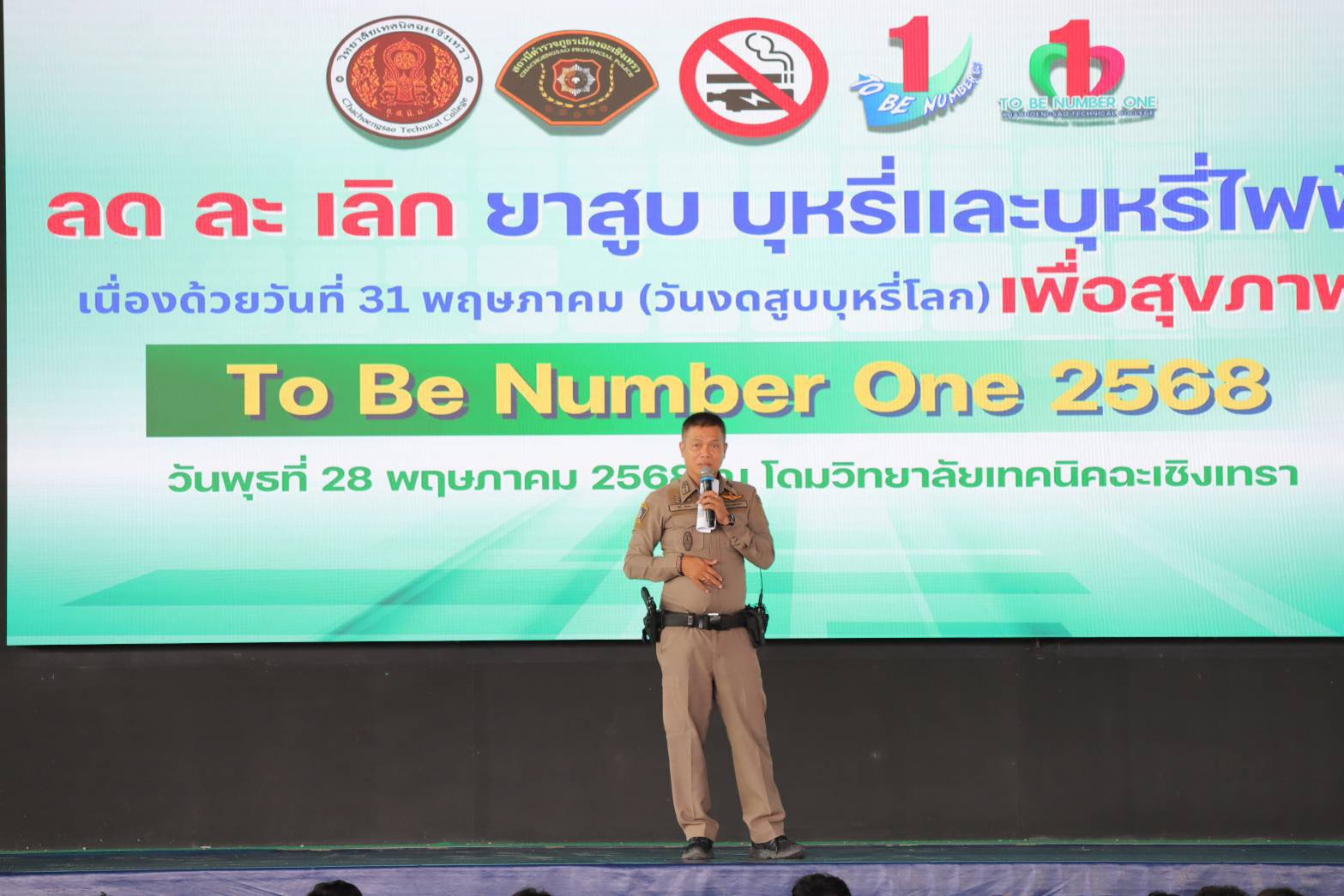 ว่าที่พันตรี ดร.วัชรพล ลักษณลม้าย ผู้อำนวยการ(วิทยฐานะเชี่ยวชาญ) วิทยาลัยเทคนิคฉะเชิงเทรา – ผู้อำนวยการสำนักงานอาชีวศึกษาจังหวัดฉะเชิงเทรา ได้มอบหมายให้ นายรุ่งเรือง สูยะนันทน์ (รองผู้อำนวยการฝ่ายพัฒนากิจการนักเรียน นักศึกษา) นายสกล มากตัน หัวหน้างานปกครอง พร้อมด้วยครูปกครอง เจ้าหน้าที่ปกครอง ดำเนินโครงการลด ละ เลิก ยาสูบ บุหรี่และบุหรี่ไฟฟ้าเพื่อสุขภาพ เนื่องด้วยวันที่ 31 พฤษภาคม (วันงดสูบบุหรี่โลก) To Be Number One 2568