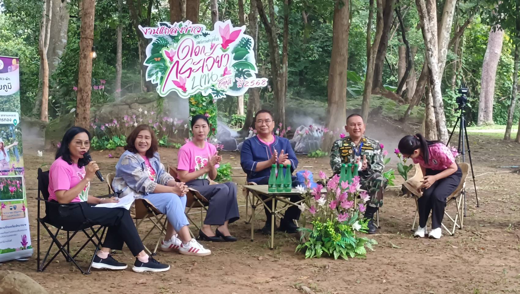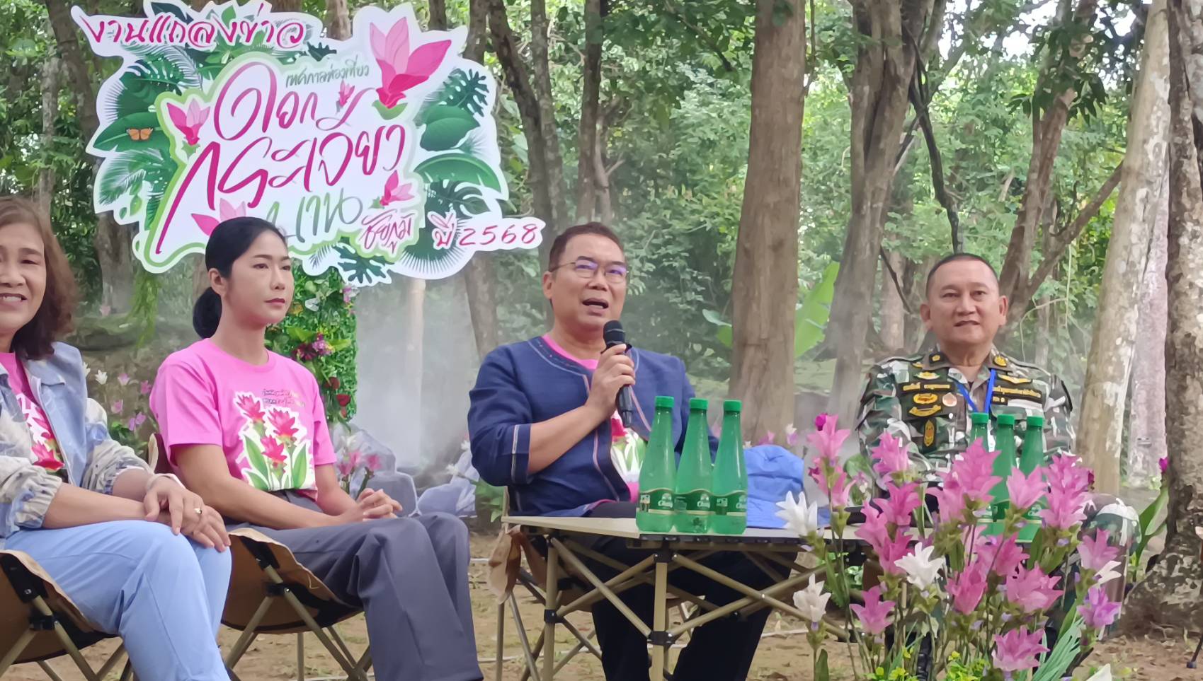 ที่อุทยานแห่งชาติป่าหินงาม โดยผู้ร่วมแถลงข่าวประกอบด้วย นายอนันต์ นาคนิยม ผู้ว่าราชการจังหวัดชัยภูมิ นายวรวิทย์ นามมหานวล นายอำเภอเทพสถิต นายสมศักดิ์ กาญจนะคช หัวหน้าอุทยานแห่งชาติป่าหินงาม นางรุ่งทิพย์ บุกขุนทด ผู้อำนวยการ ททท.สำนักงานนครราชสีมา นางสาวสุรีวรรณ นาคาศัย นายกองค์การบริหารส่วนจังหวัดชัยภูมิ และนางธิดารัตน์ อากรตน ประชาสัมพันธ์จังหวัดชัยภูมิ เพื่อประชาสัมพันธ์ข่าวสารการจัดงานเทศกาลท่องเที่ยวดอกกระเจียวบาน ประจำปี 2568 ให้ประชาชนและนักท่องเที่ยวได้รับทราบผ่านสื่อมวลชนทุกแขนง นอกจากนี้ยังมีกิจกรรมส่งเสริมการท่องเที่ยวอื่น ๆ เช่น วิ่งส่งเสริมการท่องเที่ยว(วิ่งเทรล) กิจกรรมแรลลี่ วิถีชีวิตชุมชนญัฮกุร (เนียะ-กุล) พร้อมการจำหน่ายสินค้า OTOP ของฝากของที่ระลึก สินค้าชุมชน และสินค้าที่เป็นอัตลักษณ์ดอกกระเจียว