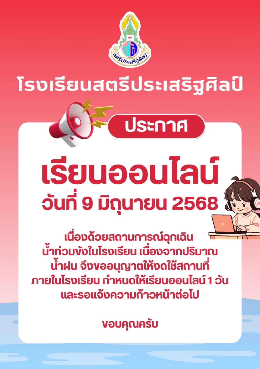 ต่อมาเวลา 06.40 น. วันที่ 9 มิถุนายน 2568 โรงเรียนสตรีประเสริฐศิลป์จังหวัดตราด ออกประกาศ เรียนออนไลน์ วันที่ 9 มิถุนายน 2658 เนื่องด้วยสถานการณ์ฉุกเฉิน น้ำท่วมขังในโรงเรียน เนื่องจากปริมาณน้ำฝน จึงขออนุญาตให้งดใช้สถานที่ภายในโรงเรียน กำหนดให้เรียนออนไลน์ 1 วันและรอแจ้งความก้าวหน้าต่อไป โดยประกาศดังกล่าวได้ส่งต่อไปยังกลุ่มไลน์นักเรียนและผู้ปกครองให้ทราบ