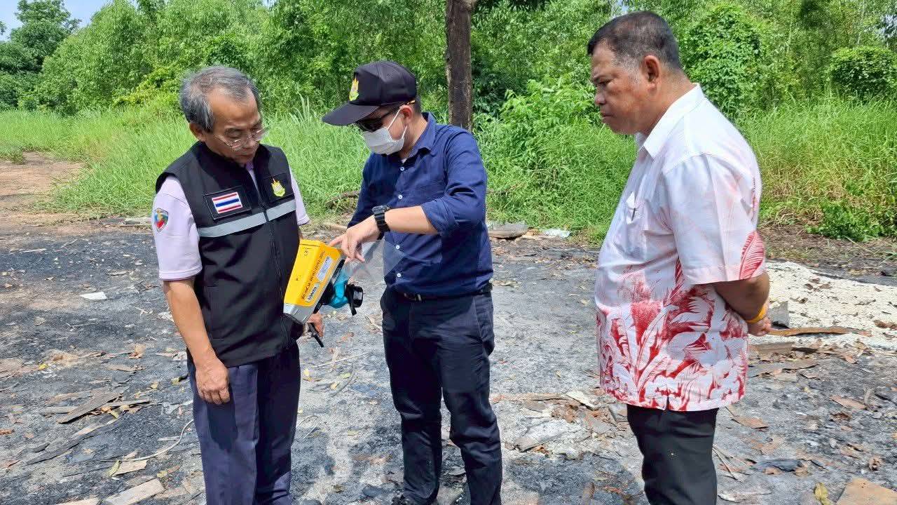 2. สคพ.13 (ชลบุรี) จึงทำการตรวจวัดธาตุในตัวอย่างเศษขี้เถ้าด้วยวิธี X-Ray Fluorescence จำนวน 3 จุด พบว่า มีค่าแบเรียม อยู่ระหว่าง 7,100 – 36,590 mg/kg ซึ่งมีค่าอยู่ในระดับสูง ทั้งนี้ ได้ตรวจสอบพื้นที่โดยรอบจุดเผา จำนวน 2 จุด พบว่า มีค่าแบเรียมต่ำกว่าจุดที่พบเศษขี้เถ้า
