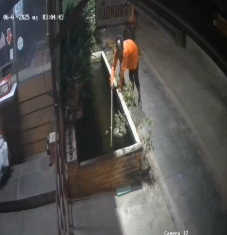 จากการตรวจสอบกล้องวงจรปิด พบว่าเวลาประมาณ 03.00 น. ของวันที่ 6 มิ.ย. 2568 ที่ผ่านมา ได้มีคนร้ายเป็นชายวัยรุ่น 1 คน ร่างผอมนุ่งกางเกงสามส่วน เสื้อสีส้ม ลักษณะผอม สวมหมวกใส่แมสปิดบังใบหน้า ได้ขับขี่รถ จักรยานยนต์ ไม่ยี่ห้อและหมายเลขทะเบียนแล้วจอดรถไว้ที่ข้างทางรินถนน จากนั้นได้เดินเข้ามาในบริเวณบ่อปลาคาร์ป หน้าร้านในมือถือสวิงตักปลา3ตัว เหลือ2 ตัว คาดว่าคนร้ายกล้วผู้พบเห็นจึงเร่งรีบได้ไปแค่ 3 ตัว อย่างลอยนวล