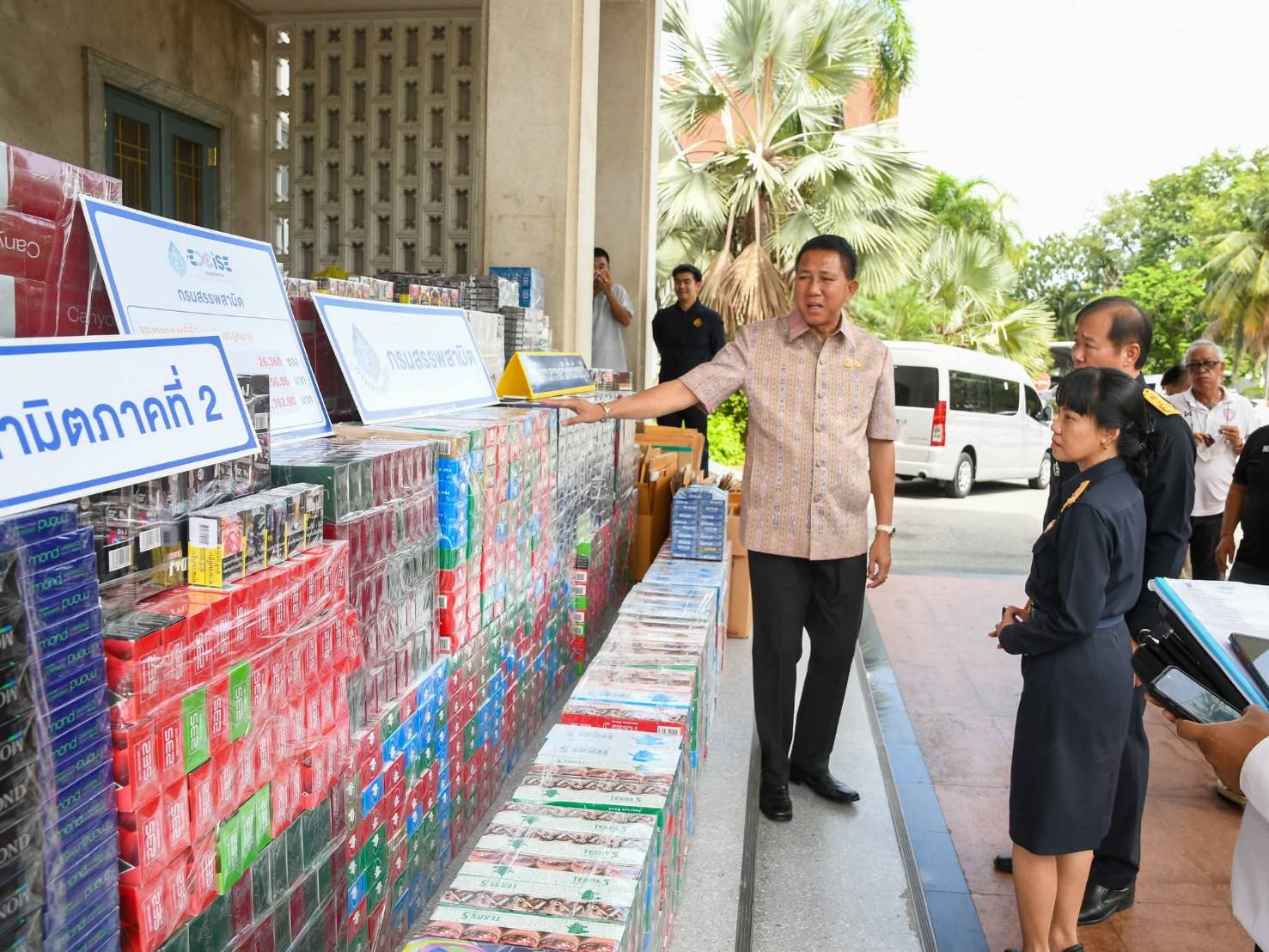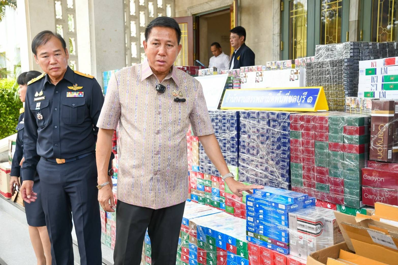 เมื่อวันที่ 18 มิถุนายน 2568 ที่บริเวณด้านหน้าศาลากลางจังหวัดชลบุรี นายธวัชชัย ศรีทอง ผู้ว่าราชการจังหวัดชลบุรี ร่วมกับ นายพยุง บุญสมสุวรรณ ผู้อำนวยการสำนักงานสรรพสามิตภาค 2 ดร.นิตยา โสรีกุล นางสาวกัญระพีร์ ศรีติพันธ์ สรรพสามิตพื้นที่ชลบุรี 1 พ.ต.อ.ณรงศ์ฤทธิ์ วาพันสุ รองผู้บังคับการตำรวจภูธรจังหวัดชลบุรี ได้ร่วมกันแถลงข่าวลักลอบขนบุหรี่ นำเข้าโดยไม่ได้เสียภาษี ได้พร้อมของกลางเป็นบุหรี่ไทย บุหรี่ต่างประเทศ ที่ไม่ใช่แสตมป์อากรไทย จำนวน 26,360 ซอง