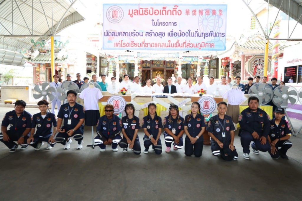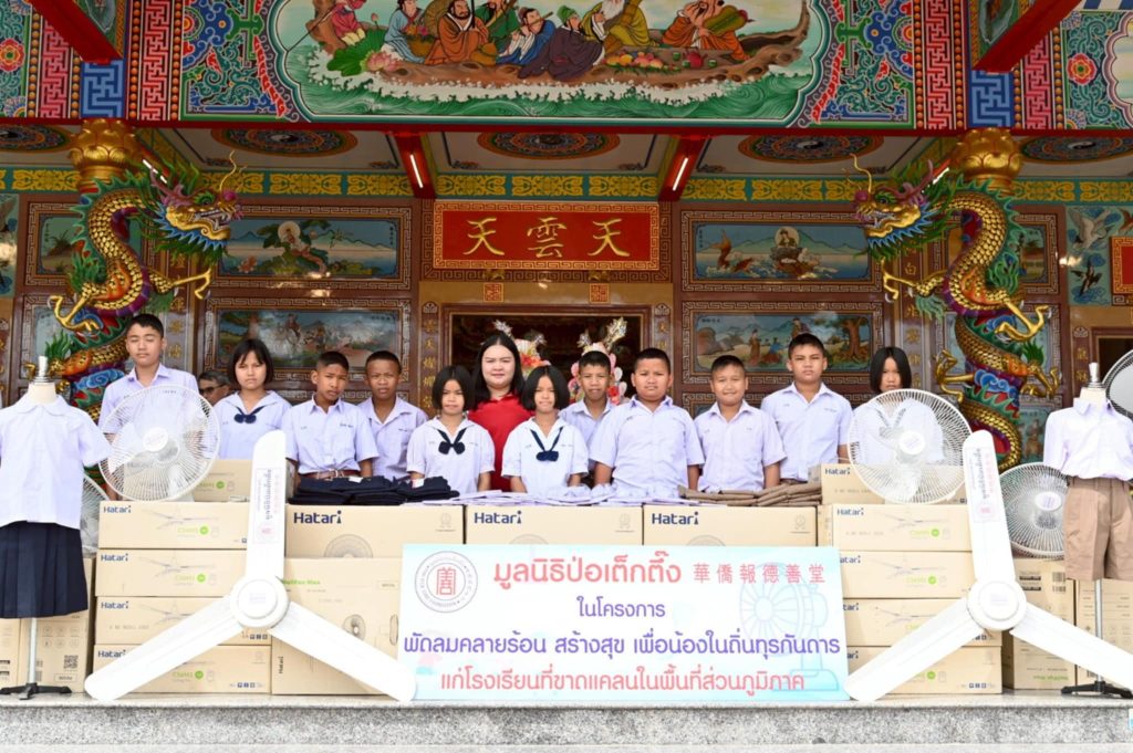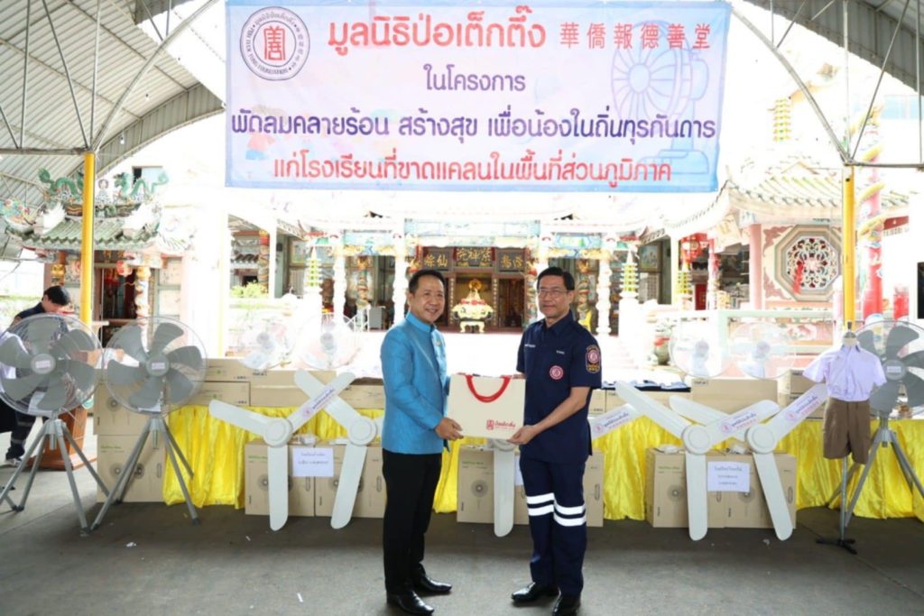 ระหว่างวันที่ 13 -19 มิถุนายน พ.ศ. 2568 ที่ผ่านมา มูลนิธิป่อเต็กตึ๊ง นำโดย นายสุรพงศ์ เสรฐภักดี กรรมการและรองเหรัญญิก พร้อมด้วย นายชูเดช เตชะไพบูลย์ ผู้ช่วยกรรมการฯ นางศิริพร กระจ่างหล้า ผู้จัดการฝ่ายสังคมสงเคราะห์ นางสาวดวงชุตา ติยะพจนพรกุล ผู้ช่วยผู้จัดการฝ่ายสังคมสงเคราะห์ และ นางสาวศุภรัตน์ สมบัติเจริญไทย หัวหน้าแผนกส่งเสริมการศึกษาและอาชีพ ลงพื้นที่มอบชุดพัดลมเพดาน แขวนผนัง และตั้งพื้น ในโครงการ พัดลมคลายร้อน สร้างสุข เพื่อน้องถิ่นทุรกันดาร ครั้งที่ 2 ให้แก่สถานศึกษาในถิ่นทุรกันดาร ประกอบด้วยจังหวัดสมุทรสาคร เพชรบุรี ระยอง ตราด และสระแก้ว รวม 5 จังหวัด 25 โรงเรียน พร้อมมอบค่าพาหนะให้แก่โรงเรียนๆ ละ 2,000 บาท และค่าติดตั้งพัดลมแก่โรงเรียนๆ ละ 3,000 บาท นอกจากนี้มูลนิธิฯ ยังได้มอบชุดนักเรียน ให้แก่นักเรียนทั้ง 25 โรงเรียน รวม 750 ชุด รวมงบประมาณทั้งสิ้น 987,050 บาท (เก้าแสนแปดหมื่นเจ็ดพันห้าสิบบาทถ้วน) เพื่อลดสภาวะอากาศร้อนภายในโรงเรียน ให้นักเรียน ครู และบุคลากรในโรงเรียนได้คลายร้อนและมีสมาธิในการเรียนการสอน โดยมี ผู้แทนจากหน่วยงานรัฐเป็นประธานในพิธี พร้อมด้วย มูลนิธิฯ / สมาคมจีนประจำจังหวัดต่างๆ เป็นผู้ประสานงานและร่วมในพิธี