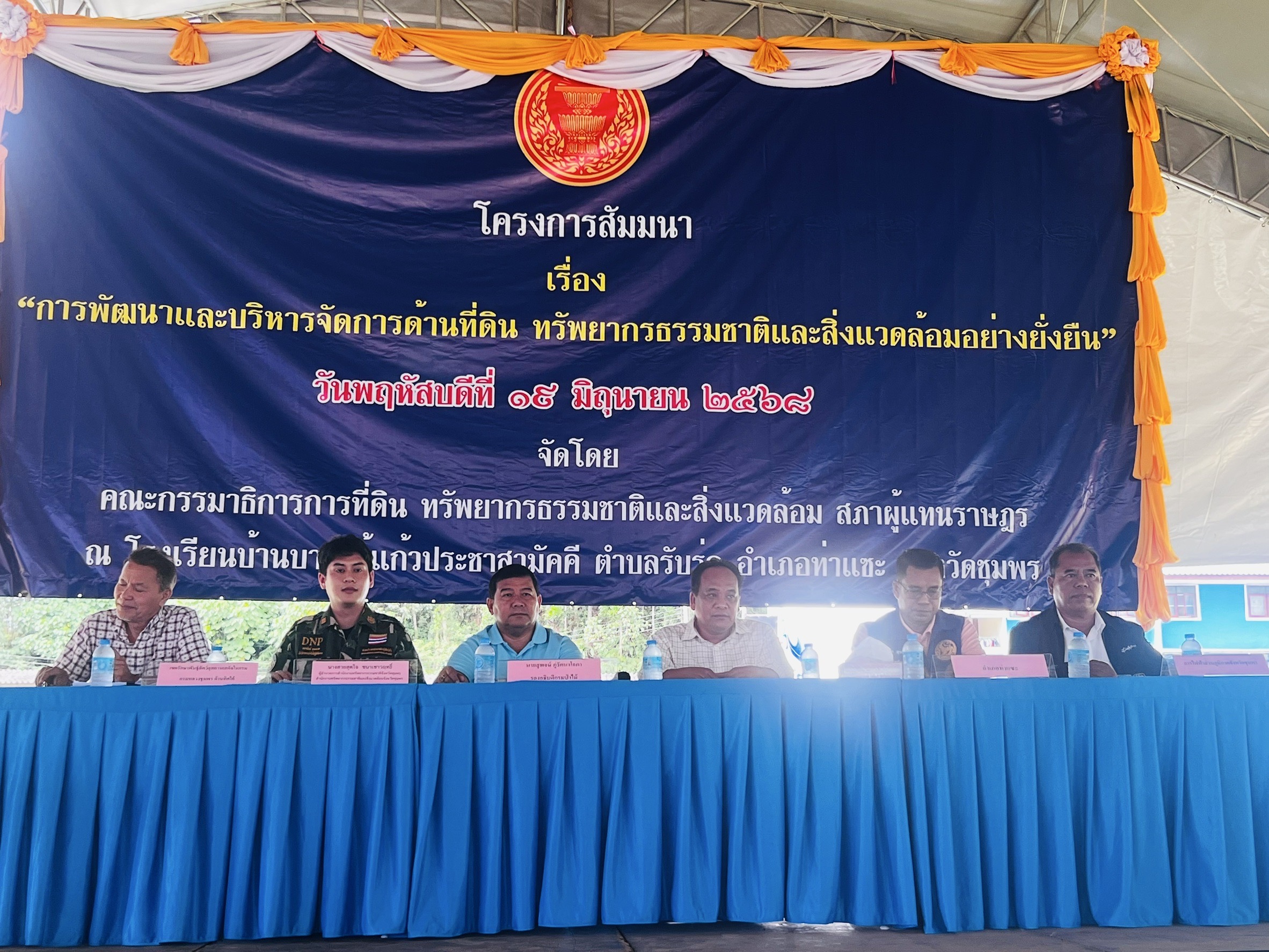 วันที่ 19 มิ.ย. 2568 ที่โรงเรียนบ้านบางไม้แก้วประชาสามัคคี ต.รับร่อ อ.ท่าแซะ จ.ชุมพร คณะคณะกรรมาธิการที่ดินธรรมชาติและสิ่งแวดล้อมสภาผู้แทนราษฎร เดินทางลงพื้นที่เพื่อสัมมนา “การพัฒนาและบริหารจัดการด้านที่ดิน ทรัพยากรธรรมชาติ และสิ่งแวดล้อมอย่างยั่งยืน ประกอบด้วย นายสันต์ แซ่ตั้ง สส.ชุมพร เขต 2 พรรครวมไทยสร้างชาติ รองประธานกรรมาธิการฯคนที่ 4 นายสุพจน์ ภู่รัตนาโอภา รองอธิบดีกรมป่าไม้ นางสายสุดใจ ชนาเชาวฤทธิ์ ผอ.สำนักทรัพยากรธรรมชาติจังหวัดชุมพร สำนักงานทรัพยากรธรรมชาติและสิ่งแวดล้อมจังหวัดชุมพร แทนผู้ว่าราชการจังหวัดชุมพร นายธนานันท์ พุทธนวล ผู้แทนกรมอุทยานแห่งชาติสัตว์ป่าและพันธุ์พืช นายลิขิต สุขเยาว์ ปลัดอำเภอหัวหน้ากลุ่มงานบริหารงานปกครอง นายสามารถ เจียวยี การไฟฟ้าส่วนภูมิภาคจังหวัดชุมพร และนายกฤษ แก้วรักษ์ รอง นายก อบจ.ชุมพร