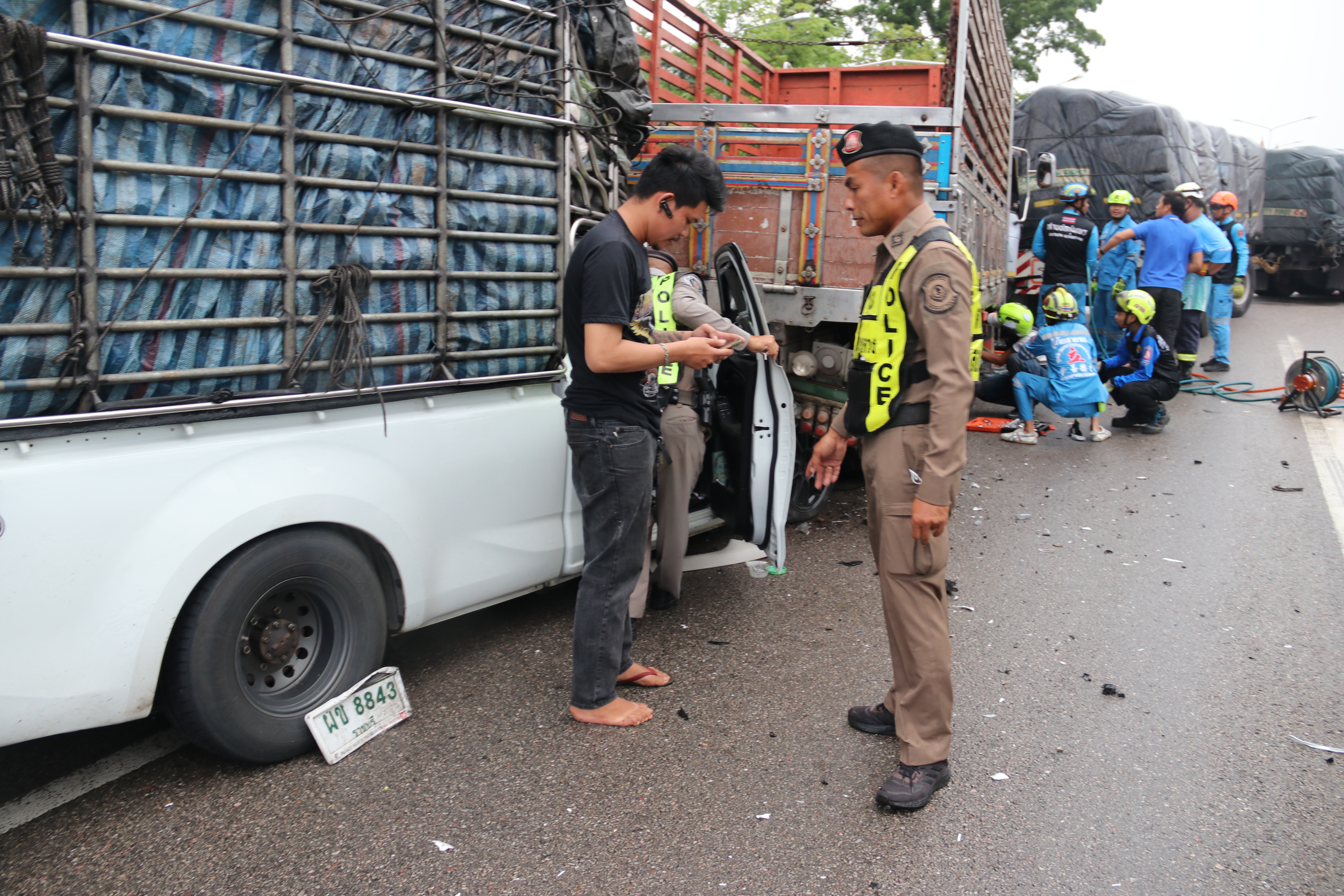 วันที่ 27 มิ.ย. 2568 พ.ต.ท.คำนวน ปฏิแพทย์ สว.สอบสวน สภ.ท่าแซะ อ.ท่าแซะ จ.ชุมพร ได้รับแจ้งจาก ร.ต.อ.วิมล แก้วชู รอง สว.(ป.)ส.ทลง.ชุมพร ว่า เกิดเหตุรถยนต์ชนกัน 3 คัน บริเวณจุดยูเทิร์น บนถนนสายเพชรเกษม หน้าป้อมบริการตำรวจทางหลวงท่าแซะ ม.8 ต.ท่าข้าม อ.ท่าแซะ จ.ชุมพร มีผู้บาดเจ็บติดภายใน จึงรุดไปตรวจสอบพร้อมประสานชุดกู้ชีพกู้ภัยสายชล มูลนิธิชุมพรการกุศลสงเคราะห์ นำอุปกรณ์ตัดถ่างเข้าช่วยเหลือ โดยในที่เกิดเหตุ พบรถบรรทุกพ่วง 22 ล้อ แบบกระเปลือย ยี่ห้อฮีโน่ สีขาว หมายเลขทะเบียนป้ายเหลือง 70-5601 เพชรบุรี ส่วนตัวพ่วงท้าย หมายเลขทะเบียนป้ายเหลือง 70-5602 เพชรบุรี จอดอยู่สภาพส่วนหัวค่อมช่องจราจรลักษณะเตรียมจะเลี้ยวกลับรถ ส่วนตัวพ่วงท้าย อยู่ช่องจราจรที่สองของช่องจราจร จากสามช่องเฉพาะจุดกลับรถ โดยมีนายอันวาร อาลี อายุ 40 ปี อยู่บ้านเลขที่ 89/3 ม.1 ต.ตะปอเยาะ อ.ยี่งอ จ.นราธิวาส เป็นคนขับ ส่วนด้านบริเวณด้านท้าย พบรถบรรทุก 6 ล้อ กระบะไม้ สีฟ้าอ่อน ยี่ห้อฮีโน่ หมายเลขทะเบียน 81-6918 เพชรบุรี อยู่ในสภาพชนอัดติดก๊อปปี้อยู่กับส่วนตัวพ่วงของรถบรรทุก 22 ล้อ โดยมีนายสุทธิพงศ์ ปิ่นพงษ์ อายุ 38 ปี เป็นชาวเพชรบุรี คนขับรถโดยช่วงขาตั้งแต่ขาลงไปถึงเท้าอัดติดอยู่กับพวงมาลัยรถและคอลโซนอยู่ภายในเก๋ง ซึ่งยังสามารถพูดโต้ตอบกับเจ้าหน้าที่ได้เป็นอย่างดี เจ้าหน้าที่ชุดกู้ชีพกู้ภัย จึงได้นำเครื่องมืออุปกรณ์ตัดถ่าง ตัดชิ้นส่วนของตัวรถ โดยใช้เวลาเพียง 10 นาที ก็สามารถนำตัวออกมาได้โดยปลอดภัย แต่กว่าจะเคลื่อนย้ายออกจากรถมาได้ อย่างทุลักทะเล เนื่องจากนายสุทธิพงษ์ มีน้ำหนักถึง 150 กก.และต้องใช้กำลังคนช่วยหามเปลกว่า 8 คน ในขณะเดียวกันพบรถยนต์กระบะคอก ยี่ห้อโตโยต้า สีขาว หมายเลขทะเบียน ผข 8843 ราชบุรี บรรทุกผักสดมาเต็มคัน อยู่ในสภาพตั้งแต่กันชนด้านหน้ารถมาจนถึงห้องเก๋งชนอัดติดมุดใต้กระบะท้ายของรถบรรทุก 6 ล้อ ส่วนตัว นายเสถียน ภูสี อายุ 30 ปี เป็นคน จ.ราชบุรี เป็นคนขับ ชาวบ้านช่วยเหลือนำออกมาจากรถได้อย่างปลอดภัย มีบาดแผลจากเศษกระจกหน้ารถที่แตกแทงเท้าเจ็บเล็กน้อยเท่านั้น