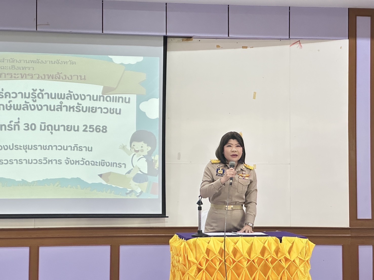 วันจันทร์ที่ 30 มิถุนายน พ.ศ. 2568 เวลา 09.30 น. ณ ห้องประชุมราชภาวนาภิธาน โรงเรียนวัดโสธรวรารามวรวิหาร อำเภอเมืองฉะเชิงเทรา นายขจรเกียรติ รักพานิชมณี ผู้ว่าราชการจังหวัดฉะเชิงเทรา มอบหมายให้ นางสาวฉัตรประอร นิยม รองผู้ว่าราชการจังหวัดฉะเชิงเทรา เป็นประธานเปิดการอบรมในหัวข้อพลังงานทดแทน และการประหยัดพลังงานสำหรับเยาวชน พร้อมด้วย นางพรรณทิพา แอดำ พลังงานจังหวัดฉะเชิงเทรา, ว่าที่ ร.ต. เกชา กลิ่นเพ็ง ผู้อำนวยการโรงเรียนวัดโสธรวรารามวรวิหาร, คณะครู อาจารย์ และนักเรียนผู้เข้าร่วมอบรม