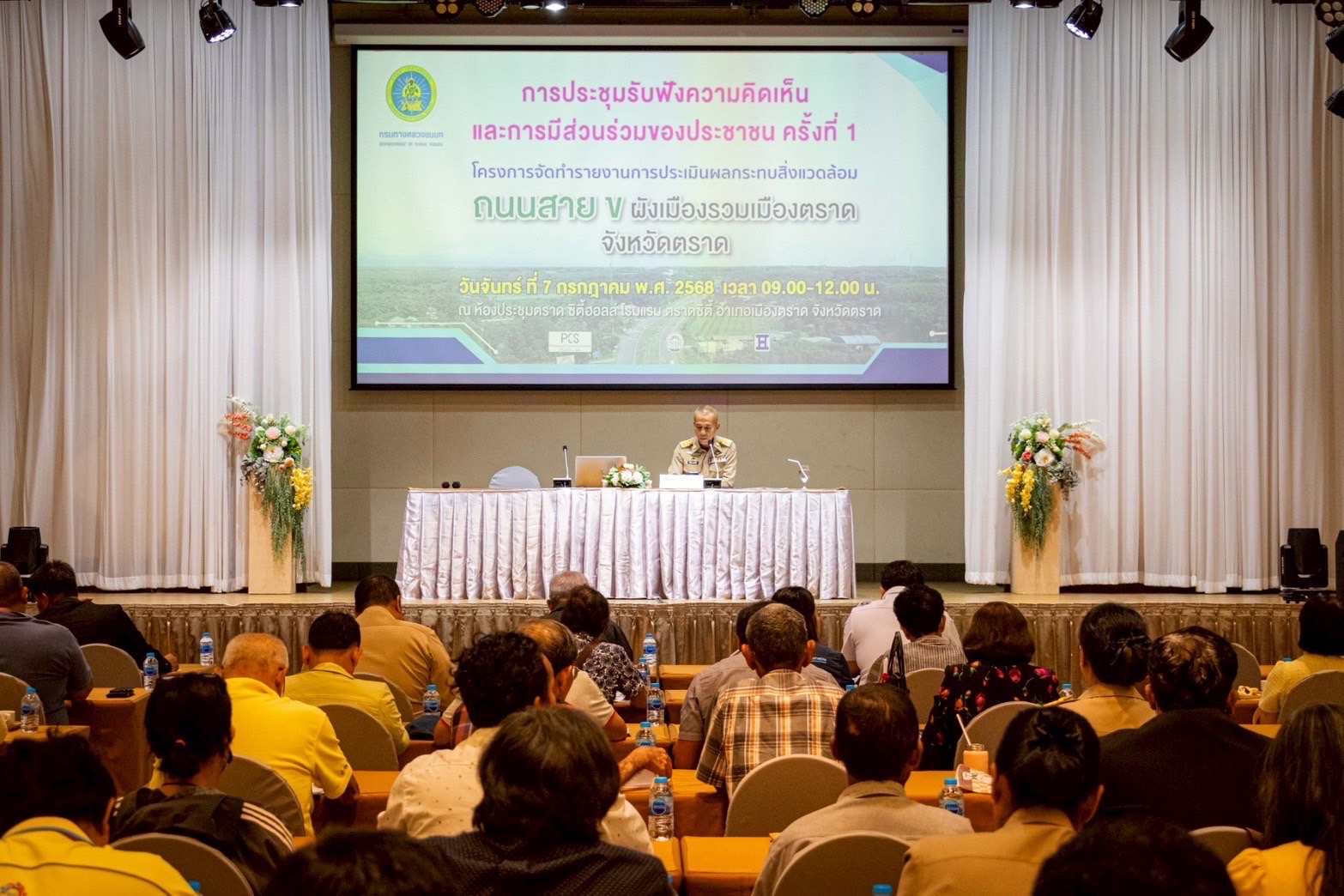 จ.ตราด/(7 ก.ค. 68) นายณัฐพงษ์ สงวนจิตร ผู้ว่าราชการจังหวัดตราด เป็นประธานเปิดเวทีการประชุมรับฟังความคิดเห็นและการมีส่วนร่วมของประชาชน ครั้งที่ 1 โครงการจัดทำรายงานการประเมินผลกระทบสิ่งแวดล้อม ถนนสาย ข ผังเมืองรวมเมืองตราด จังหวัดตราด ซึ่งกรมทางหลวงชนบท โดยกลุ่มบริษัทที่ปรึกษา จัดขึ้นโดยมีหน่วยงานภาครัฐ รัฐวิสาหกิจ องค์กรปกครองส่วนท้องถิ่น ภาคประชาชนจำนวนมากเข้าร่วมที่ห้องประชุมตตราดซิตี้ฮอลล์ โรงแรมตราดซิตี้ ตำบลวังกระแจะ อำเภอเมืองตราด