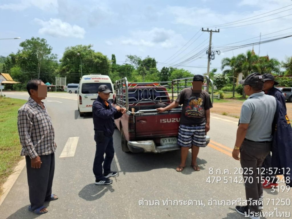 จากการวางแผนและสืบสวนพบว่า นายกิตติพล พันธ์เพิ่มพูน ได้โพสต์ภาพเกี่ยวกับการล่านกป่าคุ้มครองในพื้นที่บ้านท่ากระดาน อำเภอศรีสวัสดิ์ และมีพฤติกรรมล่าสัตว์เป็นประจำ จึงได้ติดตามความเคลื่อนไหว กระทั่งเวลา 13.00 น. วันที่ 4 กรกฎาคม 2568 เจ้าหน้าที่ตรวจพบรถยนต์กระบะต้องสงสัย ยี่ห้ออีซูซุ สีแดง ทะเบียน บว 8198 กาญจนบุรี ขับผ่านบริเวณสามแยกวัดท่ากระดาน ถนนสาย 3199 จึงเรียกตรวจสอบ พบนายกิตติพล (สงวนนามสกุล) อายุ 27 ปี เป็นคนขับ และนายทง (สงวนนามสกุล) อายุ 72 ปี เป็นผู้โดยสาร ทั้งสองเป็นชาวอำเภอสองพี่น้อง จังหวัดสุพรรณบุรี