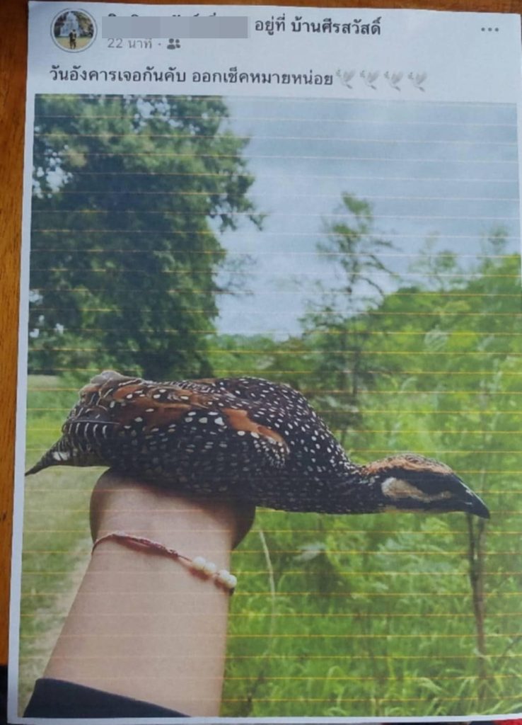 ตามคำสั่งการของนายชาติชาย ศรีแผ้ว หัวหน้าสำนักงานสนับสนุนการป้องกันและปราบปรามที่ 1 (ภาคกลาง) หลังสืบทราบว่ามีการโพสต์ภาพล่าสัตว์ป่าคุ้มครองและประกาศขายผ่านทางเฟซบุ๊ก จึงได้สั่งการให้นายพัฒนยุทธ เพ็ชรมณี หัวหน้าหน่วยปฏิบัติการพิเศษที่ 1 พร้อมคณะ ร่วมประสานการปฏิบัติกับเจ้าหน้าที่ตำรวจกองบังคับการปราบปรามการกระทำความผิดเกี่ยวกับทรัพยากรธรรมชาติและสิ่งแวดล้อม (บก.ปทส.) จังหวัดกาญจนบุรี นำโดย ร.ต.อ.กฤตพจน์ กิจชัยพร รอง สว. (ป.) กก.5 บก.ปทส. เข้าพื้นที่ตรวจสอบในเขตอำเภอศรีสวัสดิ์ จังหวัดกาญจนบุรี