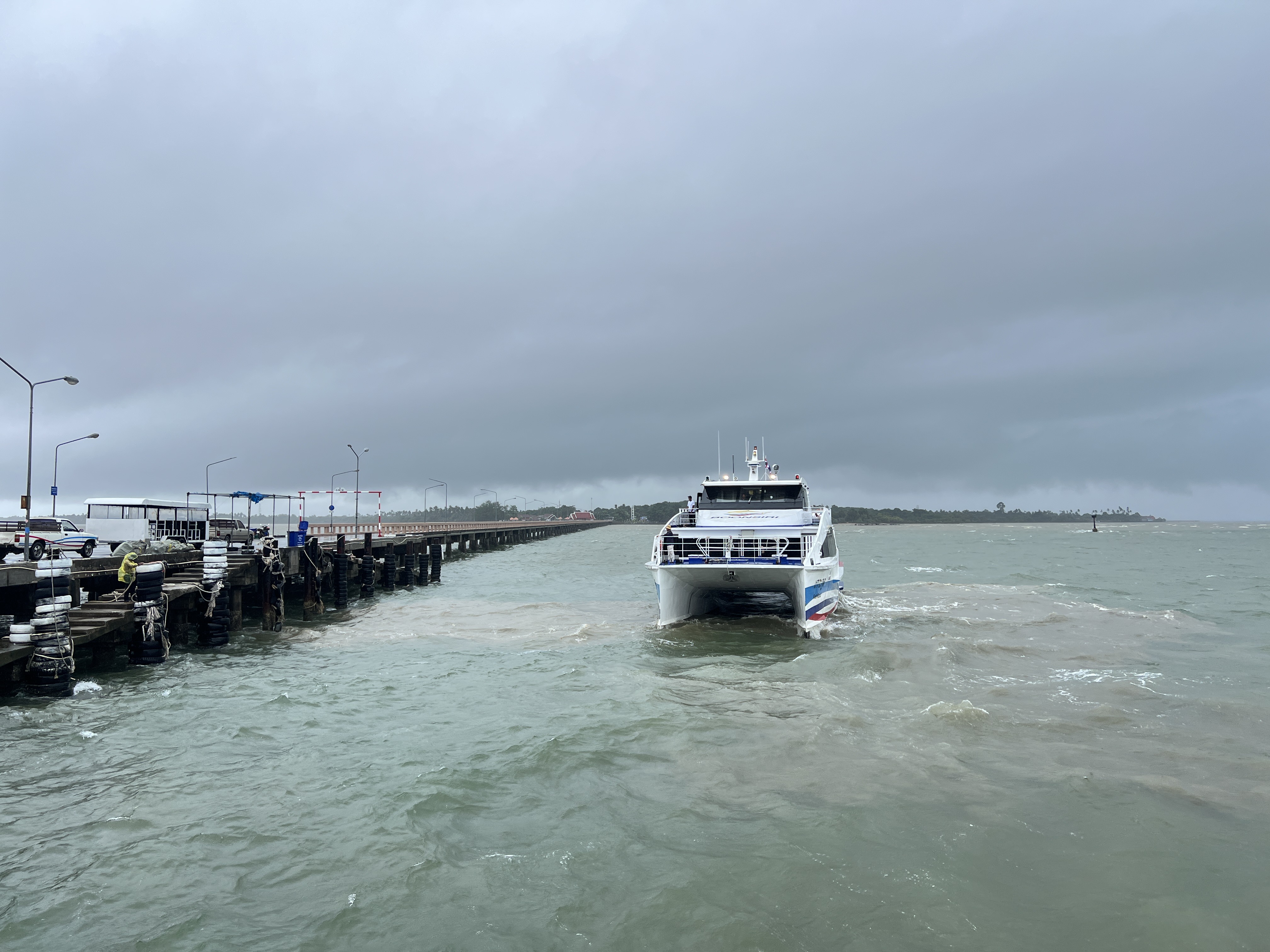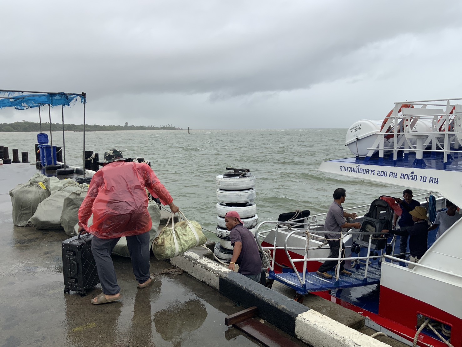โดยที่ท่าเรือแหลมศอก ต.อ่าวใหญ่ อ.เมือง จ.ตราด นักท่องเที่ยวยังคงเดินทางไปท่องเที่ยวที่อำเภอเกาะกูด โดยมีเรือโดยสาร 3 บริษัท เปิดบริการ แม้ในช่วงนี้จะลดเที่ยวเดินทางไปเนื่องจากจำนวนนักท่องเที่ยวลดลง แต่ยังมีบริการให้ไปเกาะกูด 5-6 เที่ยว/วัน และกลับอีก 4 เที่ยว ซึ่งตั้งแต่ช่วงเช้า เวลา 09.45-12.00 น. มี 3บริษัท นำเรือมาให้บริการ และช่วง 13.00 น. เรือโดยของบริษัท บุญศิริเรือเร็ว และเรือโดยสารเสือดำโกร จำกัดได้นำเรือมาให้บริการ และมีนักท่องเที่ยวกว่า 1,000 -1,200 คน เดินทางไปเกาะกูด แม้จะมีคลื่นลมแรง แต่ไม่มีฝนตกและสามารถเดินทางไปได้