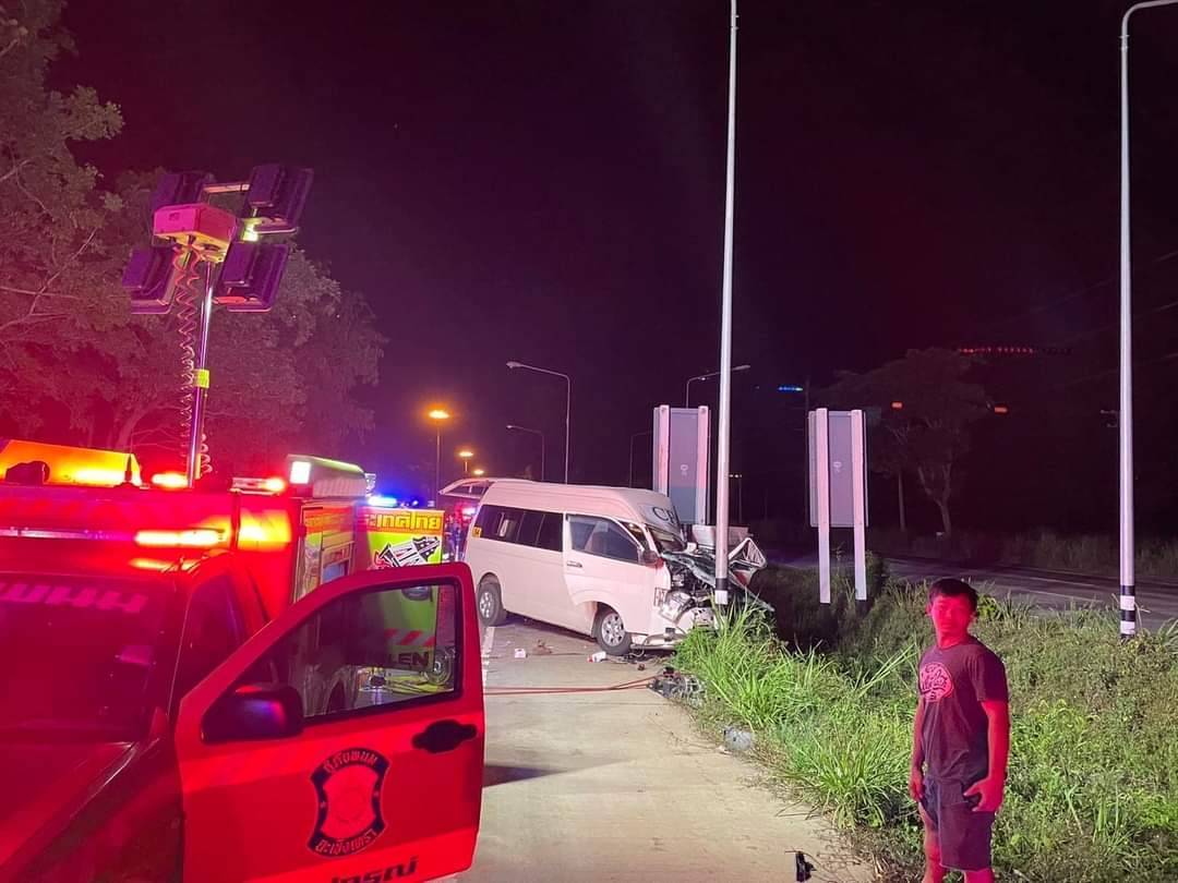 ชุลมุนอรุณรุ่งใกล้ฟ้าสาง ระดมเจ้าหน้าที่กู้ภัยพนมพร้อมอุปกรณ์ตัดถ่างรถเข้าช่วยเหลือผู้บาดเจ็บติดภายในรถตู้ ชาย4 หญิง 12 สาหัส ใช้เวลาไปกว่าครึ่งชั่วโมง บนถนน304 เหตุรถตู้โดยสารบริษัทแห่งหนึ่งบรรทุกแรงงานต่างด้าวเฉี่ยวชนรถบรรทุกพ่วง 18 ล้อเต็มแรง ก่อนสะบัดเข้าชนเสาไฟฟ้าแรงสูง