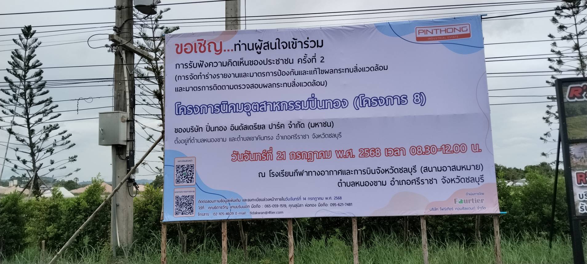 วันนี้ (21 ก.ค.2568) ที่อาคารโดมโรงเรียนกีฬาทางอากาศและสนามบินจังหวัดชลบุรีติดอ่างเก็บน้ำหนองค้อ ตำบลหนองขามอ.ศรีราชา จ.ชลบุรี บริษัท ปิ่นทอง อินดัสเตรียล ปาร์ค จำกัด เปิดประชุมการประชาสัมพันธ์และรับฟังความคิดเห็นประชาชน ครั้งที่ 2 โครงการนิคมอุตสาหกรรมปิ่นทอง โครงการ 8 ที่มีโครงการจะก่อสร้างในพื้นที่ตำบลหนองขาม โดยมีนายสุจินต์ เรียนวิริยะกิจ กรรมการบริหารบริษัท ปิ่นทอง อินดัสเตรียล ปาร์ค จำกัด กล่าวรายงานต่อ นางสาวศิริลักษณ์ วิศวะรุ่งโรจน์ อุตสาหกรรมจังหวัดชลบุรี ประธานในพิธี ว่าต้องร่างขอบเขตการศึกษารายงานการวิเคราะห์ผลกระทบสิ่งแวดล้อม โดยมีประชาชนในพื้นที่ตำบลหนองขามและใกล้เคียงกว่า 500 คน ร่วมรับฟังครั้งนี้ โดยมี นายสุรชัย คำศรี ปลัดอำเภอศรีราชาตัวแทนนายอำเภอศรีราชา นายมานะ ฉิมชา รองนายกเทศมนตรีเทศบาลนครเจ้าพระยาสุรศักดิ์ นายพิชัย โสธรวงศ์ นายกองค์การบริหารส่วนตำบลหนองขาม นายสมหมาย จันทร์ฉาย อดีตนายกอบต.หนองขามและสมาชิกสภาเทศบาลนครเจ้าพระยาสุศักดิ์ รวมถึงผู้นำท้องถื่นในพื้นที่เข้าร่วมรับฟังในครั้งนี้ด้วย