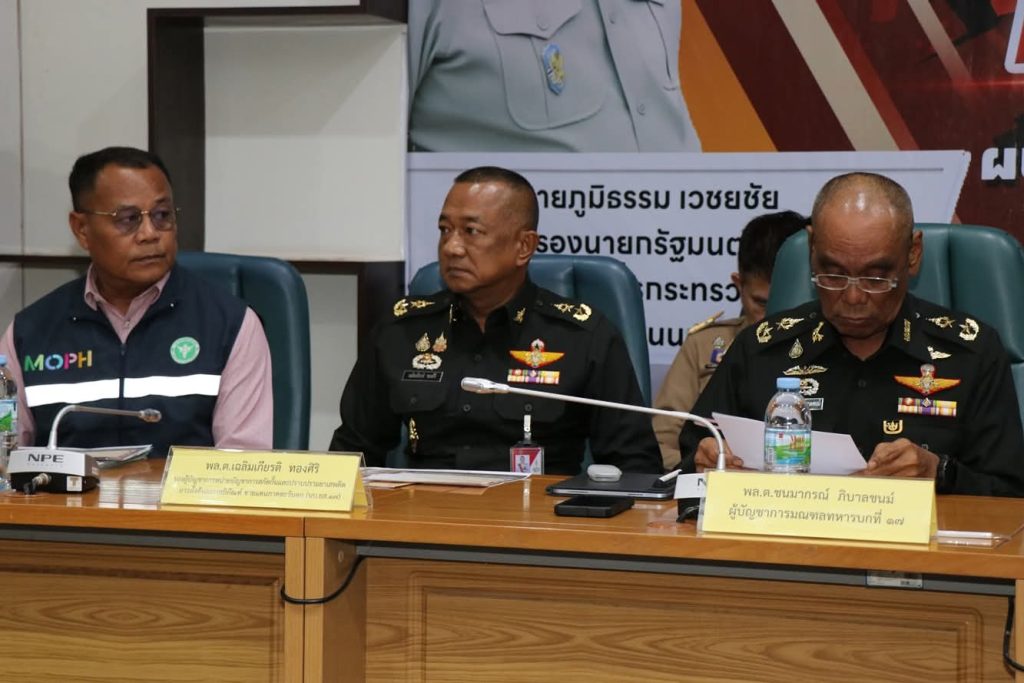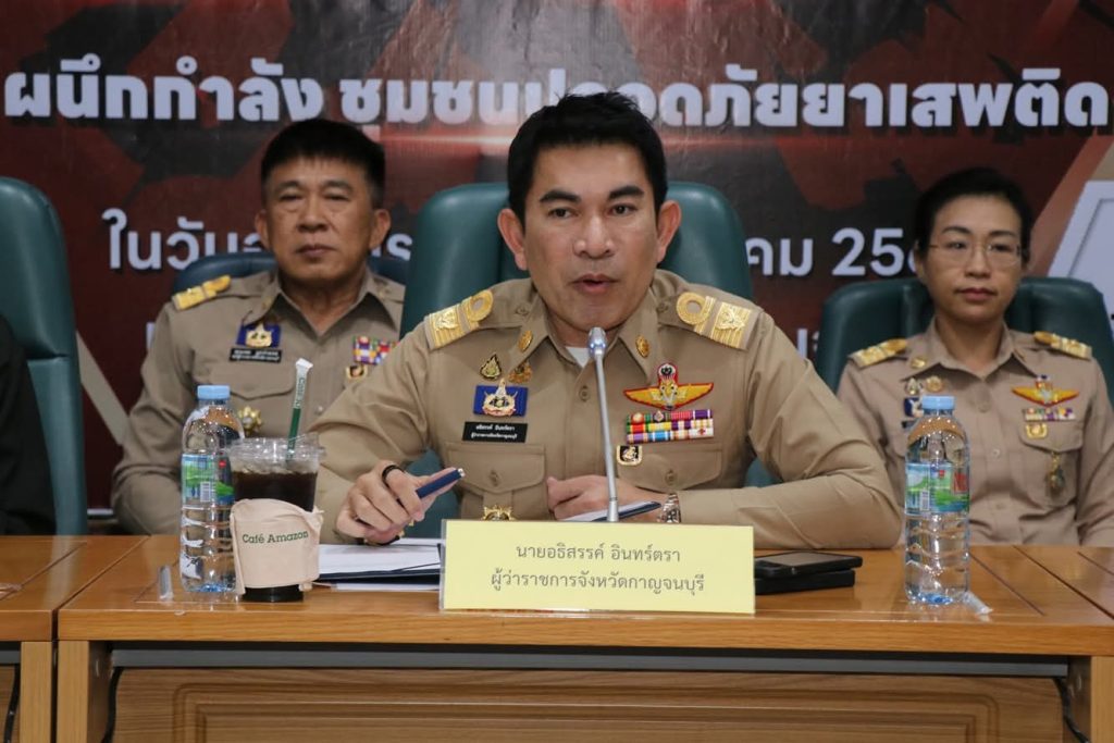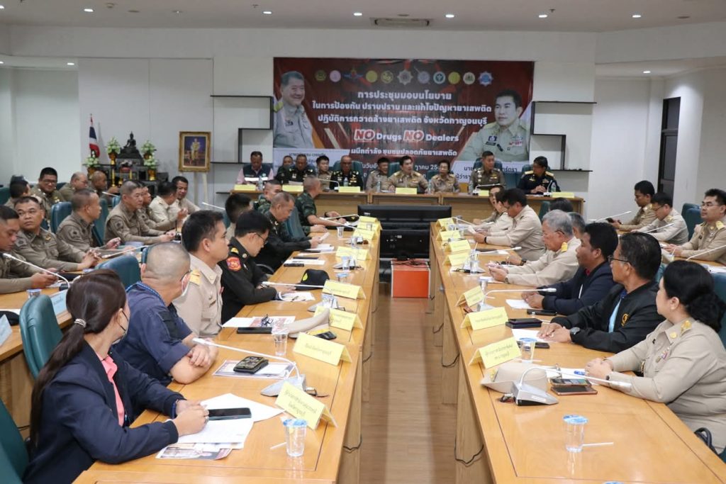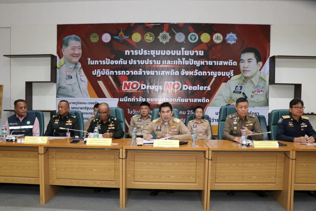 วันที่ (22 กรกฎาคม 2568) เวลา 15.00 น. ที่ห้องประชุมแควใหญ่ ชั้น 5 ศาลากลางจังหวัดกาญจนบุรี นายอธิสรรค์ อินทร์ตรา ผู้ว่าราชการจังหวัดกาญจนบุรี ในฐานะผู้อำนวยการศูนย์อำนวยการป้องกันและปราบปรามยาเสพติดจังหวัดกาญจนบุรี เป็นประธานในพิธีมอบนโยบายการป้องกัน ปราบปราม และแก้ไขปัญหายาเสพติดแก่หน่วยงานทุกภาคส่วนที่เกี่ยวข้อง พร้อมปล่อยแถวเปิดปฏิบัติการกวาดล้างยาเสพติด ภายใต้ชื่อ “No Drugs No Dealers ผนึกกำลัง ชุมชนปลอดยาเสพติด”
