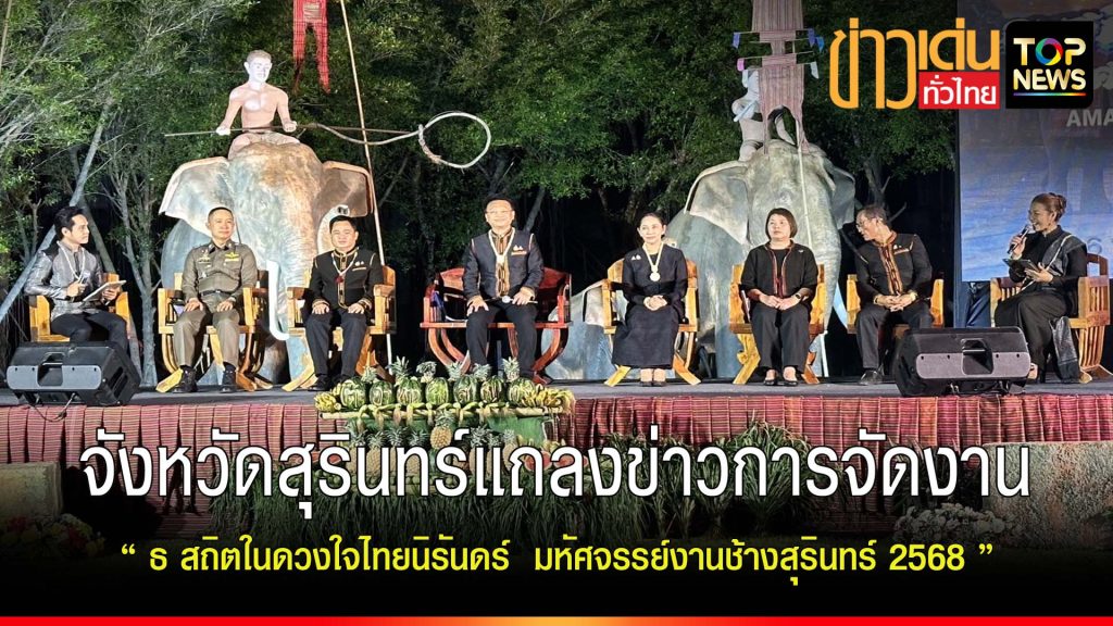 เมื่อวันที่ 10 พฤศจิกายน 2568 เวลา 15.30 น. ณ บริเวณด้านหน้าหอชมวิว โครงการโลกของช้าง ศูนย์คชศึกษา บ้านตากลาง ตำบลกระโพ อำเภอท่าตูม จังหวัดสุรินทร์ จังหวัดสุรินทร์ ร่วมกับ องค์การบริหารส่วนจังหวัดสุรินทร์ นำโดย นายประภาส ศรีจันทร์เวียง รองผู้ว่าราชการจังหวัดสุรินทร์ รักษาราชการแทนผู้ว่าราชการจังหวัดสุรินทร์ นายกิตติ สัตย์ซื่อ ปลัดจังหวัดสุรินทร์ , ส.ส.ปกรณ์ มุ่งเจริญพร , ส.ส.ผกามาศ เจริญพันธ์ , นางธัญพร มุ่งเจริญพร นายกองค์การบริหารส่วนจังหวัดสุรินทร์ พร้อมด้วยบุคลากรองค์การบริหารส่วนจังหวัดสุรินทร์ และหน่วยงานที่มีส่วนเกี่ยวข้องร่วมกันจัดงานแถลงข่าว “งาน ธ สถิตในดวงใจไทยนิรันดร์ มหัศจรรย์งานช้างสุรินทร์ 2568 ”