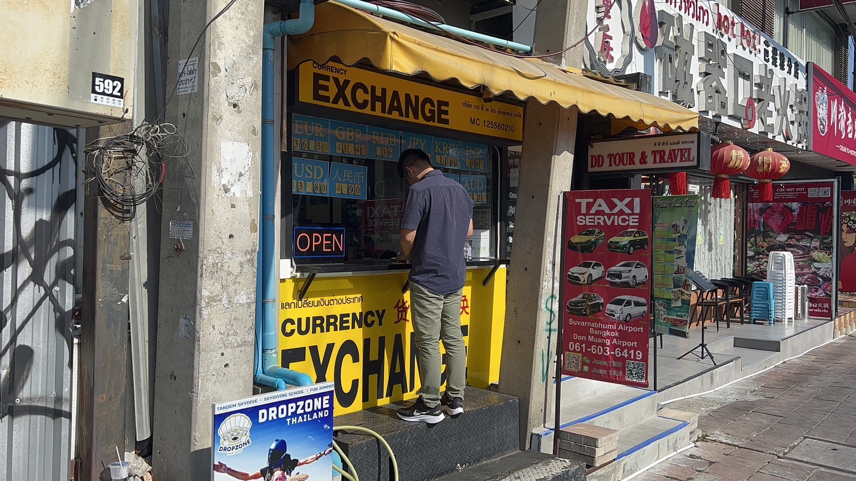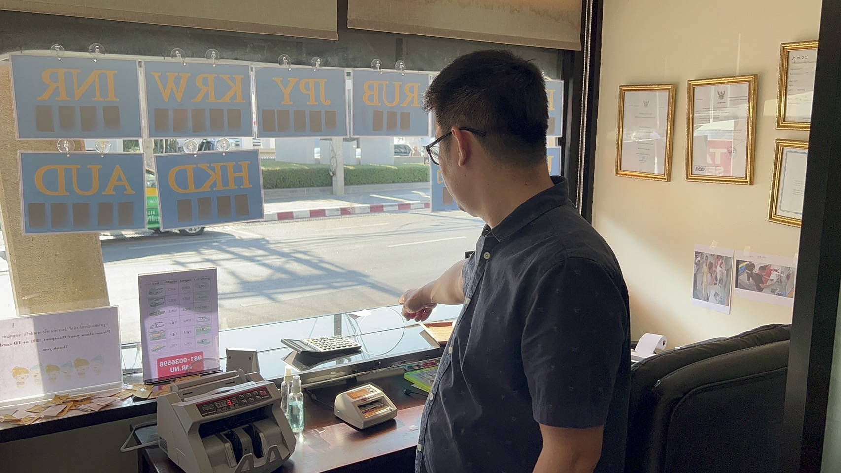 นายเกียรติศักดิ์ มีบุญ เล่าว่าตอนเช้าก็มาทำงานปกติในเวลา 08.00น. แต่เมื่อเปิดบูทรับแลกเงินตราต่างประเทศก็พบว่ากล่องใส่เหรียญหายไป จึงไปเปิดดูภาพจากกล้องวงจรปิดภายในบูท ก็พบว่าในช่วงเวลา 07.00 น.ได้มีชายชาวต่างชาติแต่งตัวดูดีเดินมาที่หน้าบูทแลกเงิน ก่อนจะเคาะกระจกบูทดูว่ามีคนอยู่หรือไม่ เมื่อเห็นว่าไม่มีคน แต่พบเห็นช่องสำหรับแลกเปลี่ยนเปิดทิ้งไว้เนื่องจากมีขนาดเล็ก จึงส่องดูด้านก่อนเอามือล้วงและเอื้อมไปหยิบกล่องที่ใส่เหรียญออกไปและก่อนจะเดินหายไปหน้าตาเฉย