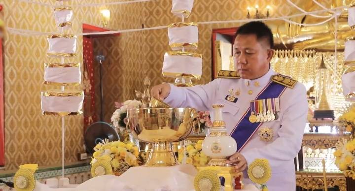 โดยนายธวัชชัย ศรีทอง ผู้ว่าราชการจังหวัดชลบุรี เชิญใบพลู 7 ใบ ถวายประธานสงฆ์เจิมใบพลู ประธานสงฆ์ถวายใบพลู 7 ใบ แด่พระสงฆ์เถราจารย์ จากนั้นพระสงฆ์เถราจารย์ ดับเทียนชัย ระหว่างที่พระสงฆ์ 10 รูป เจริญพระพุทธมนต์คาถา ดับเทียนชัย จากนั้นพระสงฆ์พรมน้ำพระพุทธมนต์ที่ขันสาคร และมอบขันสาครให้ผู้ว่าราชการจังหวัดชลบุรี ก่อนจะกล่าวคาถาตักน้ำเพื่อตักน้ำพระพุทธมนต์ศักดิ์สิทธิ์จากขันสาครใส่คนโท โดยพระสงฆ์สวดเจริญชัยมงคลคาถา